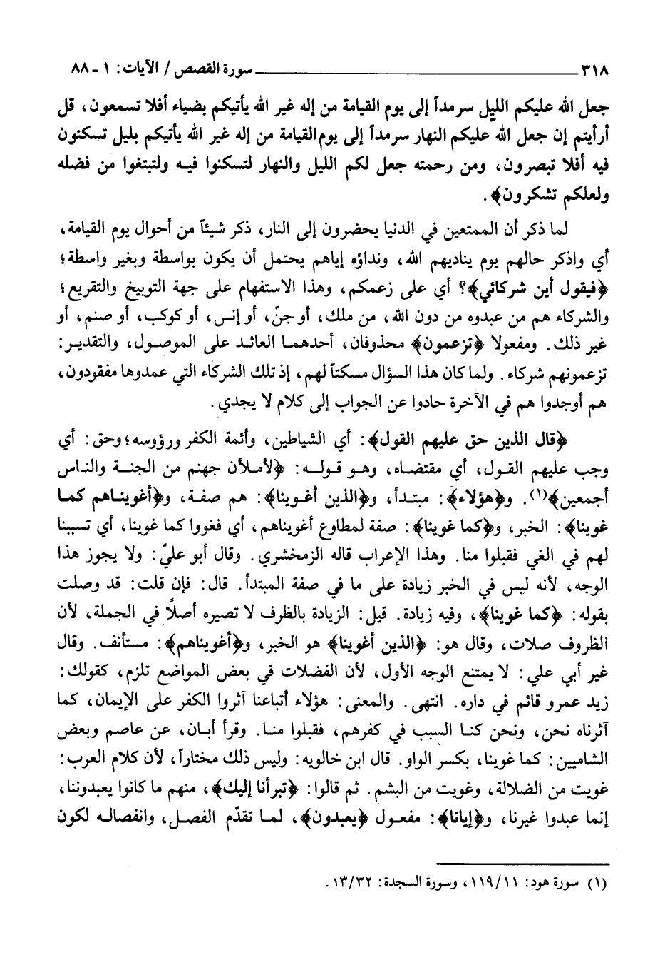 قالَ الَّذِينَ حَقَّ عَلَيْهِمُ الْقَوْلُ: أَيِ الشَّيَاطِينُ، وأئمة الكفر ورؤوسه وحق: أَيْ وَجَبَ عَلَيْهِمُ الْقَوْلُ، أَيْ مُقْتَضَاهُ، وَهُوَ قَوْلُهُ: لَأَمْلَأَنَّ جَهَنَّمَ مِنَ الْجِنَّةِ وَالنَّاسِ أَجْمَعِينَ «1» . وهؤُلاءِ: مبتدأ، والَّذِينَ أَغْوَيْنا: هم صفة، وأَغْوَيْناهُمْ كَما غَوَيْنا: الخبر، وكَما غَوَيْنا: صِفَةٌ لِمُطَاوِعِ أَغْوَيْنَاهُمْ، أَيْ فَغَوَوْا كَمَا غَوَيْنَا، أَيْ تَسَبَّبْنَا لَهُمْ فِي الْغَيِّ فَقَبِلُوا مِنَّا. وَهَذَا الْإِعْرَابُ قَالَهُ الزَّمَخْشَرِيُّ. وَقَالَ أَبُو عَلِيٍّ: وَلَا يَجُوزُ هَذَا الْوَجْهُ، لِأَنَّهُ لَيْسَ فِي الْخَبَرِ زِيَادَةٌ عَلَى مَا فِي صِفَةِ الْمُبْتَدَإِ. قَالَ: فَإِنْ قُلْتَ: قَدْ وُصِلَتْ بِقَوْلِهِ: كَما غَوَيْنا، وَفِيهِ زِيَادَةٌ. قِيلَ: الزِّيَادَةُ بِالظَّرْفِ لَا تُصَيِّرُهُ أَصْلًا فِي الْجُمْلَةِ، لِأَنَّ الظُّرُوفَ صِلَاتٌ، وَقَالَ هُوَ: الَّذِينَ أَغْوَيْنا هو الخبر، وأَغْوَيْناهُمْ: مُسْتَأْنَفٌ. وَقَالَ غَيْرُ أَبِي عَلِيٍّ: لَا يَمْتَنِعُ الْوَجْهُ الْأَوَّلُ، لِأَنَّ الْفَضَلَاتِ فِي بَعْضِ الْمَوَاضِعِ تَلْزَمُ، كَقَوْلِكَ: