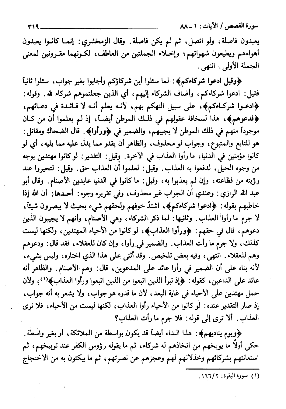 وَقِيلَ ادْعُوا شُرَكاءَكُمْ: لَمَّا سُئِلُوا أَيْنَ شُرَكَاؤُكُمْ وَأَجَابُوا بِغَيْرِ جَوَابٍ، سُئِلُوا ثَانِيًا فَقِيلَ: ادْعُوا شُرَكَاءَكُمْ، وَأَضَافَ الشُّرَكَاءَ إِلَيْهِمْ، أَيِ الَّذِينَ جَعَلْتُمُوهُمْ شُرَكَاءَ لِلَّهِ. وَقَوْلُهُ: