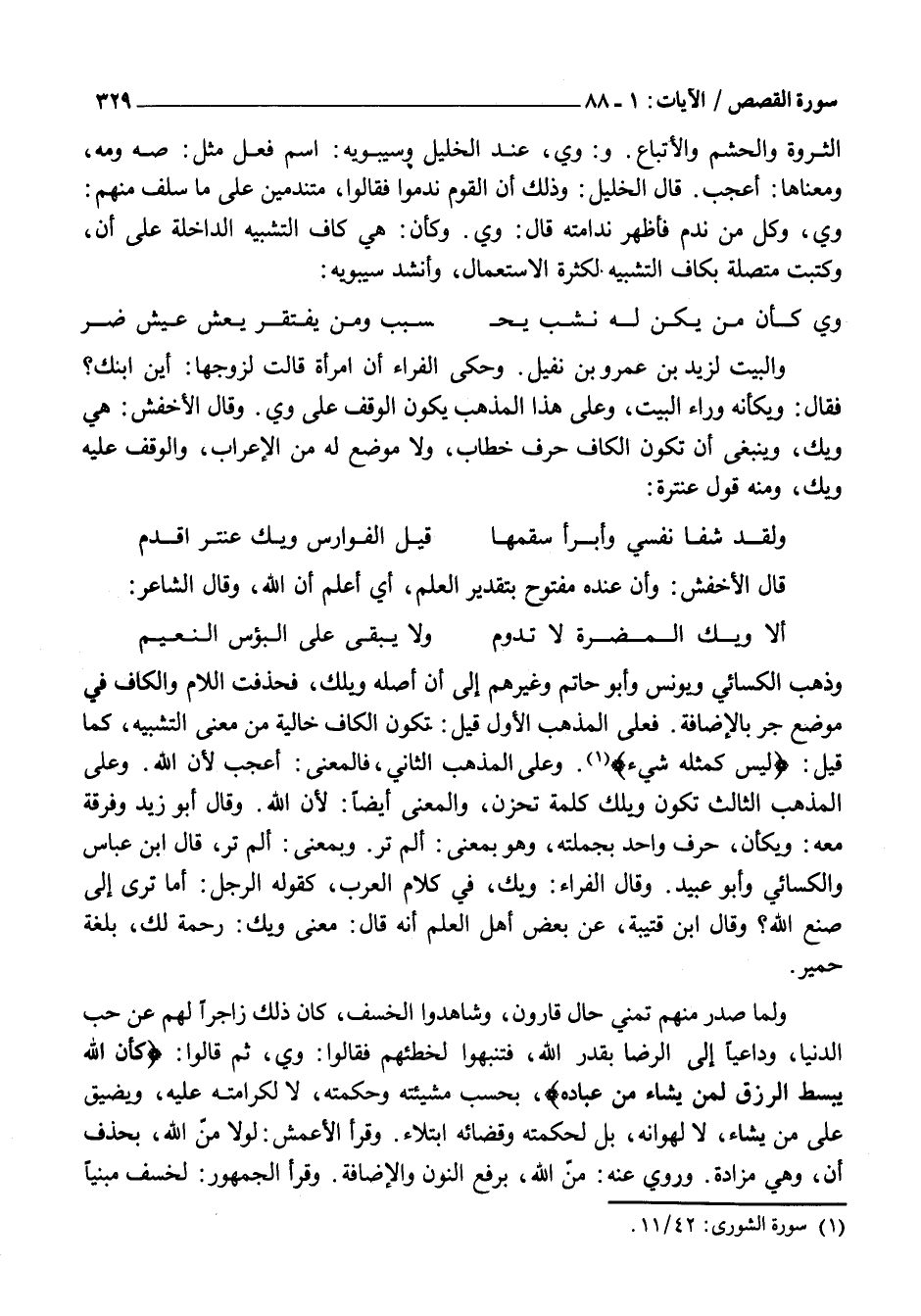 الثَّرْوَةِ وَالْحَشَمِ وَالْأَتْبَاعِ. وَ: وَيْ، عِنْدَ الْخَلِيلِ وَسِيبَوَيْهِ: اسْمُ فِعْلٍ مِثْلُ: صَهْ وَمَهْ، وَمَعْنَاهَا: أَعْجَبُ. قَالَ الْخَلِيلُ: وَذَلِكَ أَنَّ الْقَوْمَ نَدِمُوا فَقَالُوا، مُتَنَدِّمِينَ عَلَى مَا سَلَفَ مِنْهُمْ: