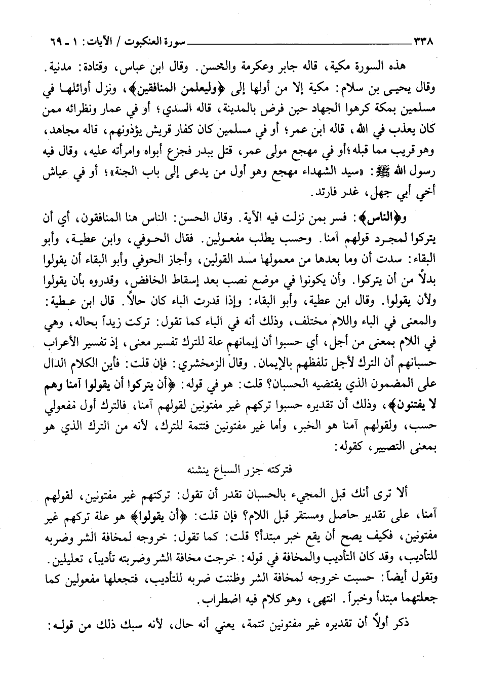وَقَالَ يَحْيَى بْنُ سَلَّامٍ: مَكِّيَّةٌ إِلَّا مِنْ أَوَّلِهَا إِلَى وَلَيَعْلَمَنَّ الْمُنافِقِينَ، وَنَزَلَ أَوَائِلُهَا فِي مُسْلِمِينَ بِمَكَّةَ كَرِهُوا الْجِهَادَ حِينَ فُرِضَ بِالْمَدِينَةِ، قَالَهُ السُّدِّيُّ أَوْ فِي عَمَّارٍ وَنُظَرَائِهِ مِمَّنْ كَانَ يُعَذَّبُ فِي اللَّهِ، قَالَهُ ابْنُ عُمَرَ أَوْ فِي مُسْلِمِينَ كَانَ كُفَّارُ قُرَيْشٍ يُؤْذُونَهُمْ، قَالَهُ مُجَاهِدٌ، وَهُوَ قَرِيبٌ مِمَّا قَبْلَهُ أَوْ فِي مِهْجَعٍ مَوْلَى عُمَرَ، قُتِلَ بِبَدْرٍ فَجَزِعَ أَبَوَاهُ وَامْرَأَتُهُ عَلَيْهِ،