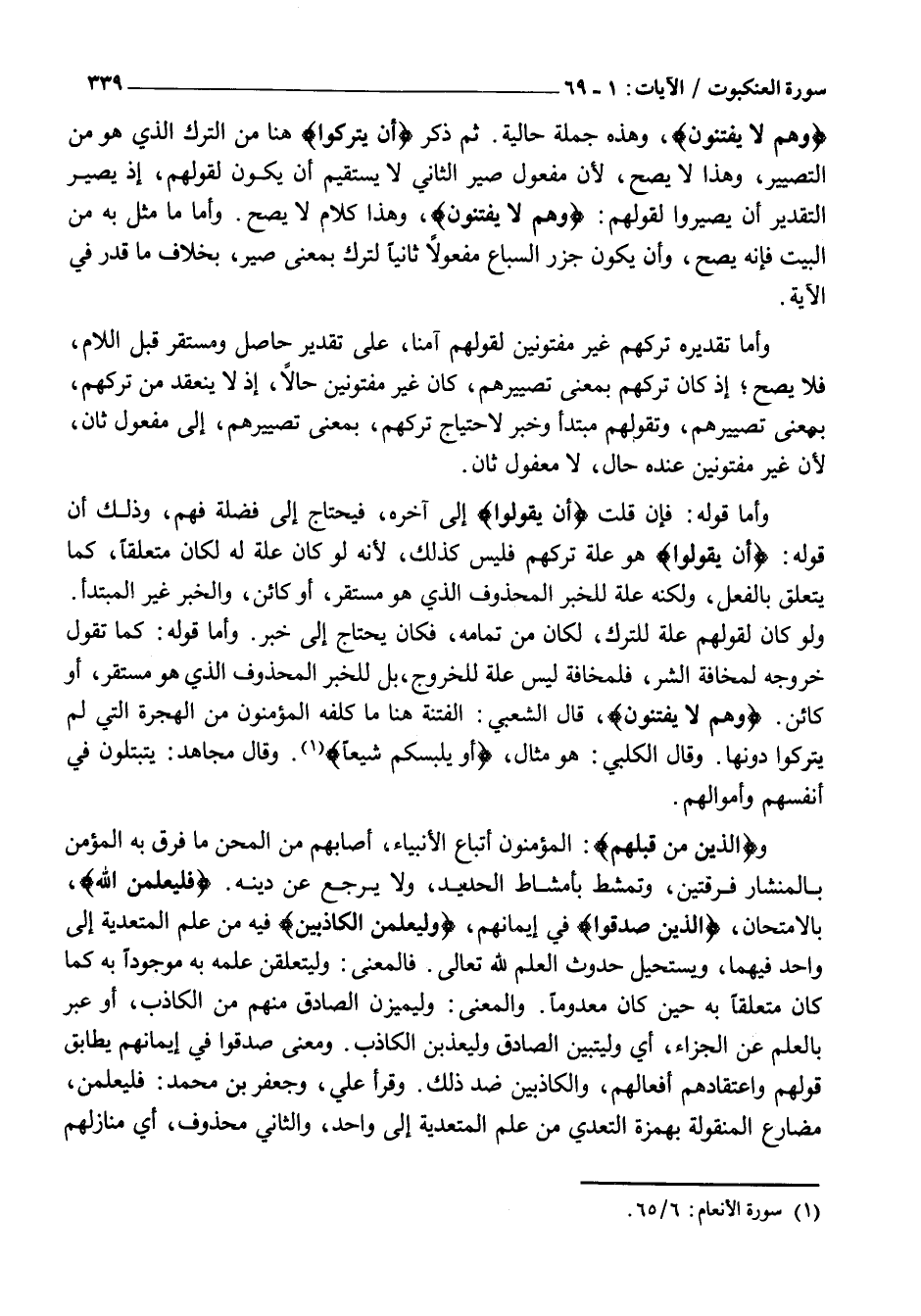 وَلَوْ كَانَ لِقَوْلِهِمْ عِلَّةٌ لِلتَّرْكِ، لَكَانَ مِنْ تَمَامِهِ، فَكَانَ يَحْتَاجُ إِلَى خبر. وَأَمَّا قَوْلُهُ: كَمَا تَقُولُ خروجه لمخافة الشر، فلمخافة لَيْسَ عِلَّةً لِلْخُرُوجِ، بَلْ لِلْخَبَرِ الْمَحْذُوفِ الَّذِي هُوَ مُسْتَقِرٌّ، أَوْ كَائِنٌ. وَهُمْ لَا يُفْتَنُونَ، قَالَ الشَّعْبِيُّ: الْفِتْنَةُ هُنَا مَا كَلِفَهُ الْمُؤْمِنُونَ مِنَ الْهِجْرَةِ الَّتِي لَمْ يُتْرَكُوا دُونَهَا. وَقَالَ الْكَلْبِيُّ: هُوَ مِثَالُ، أَوْ يَلْبِسَكُمْ شِيَعاً «1» . وَقَالَ مُجَاهِدٌ: يتبتلون في أنفسهم وأموالهم.