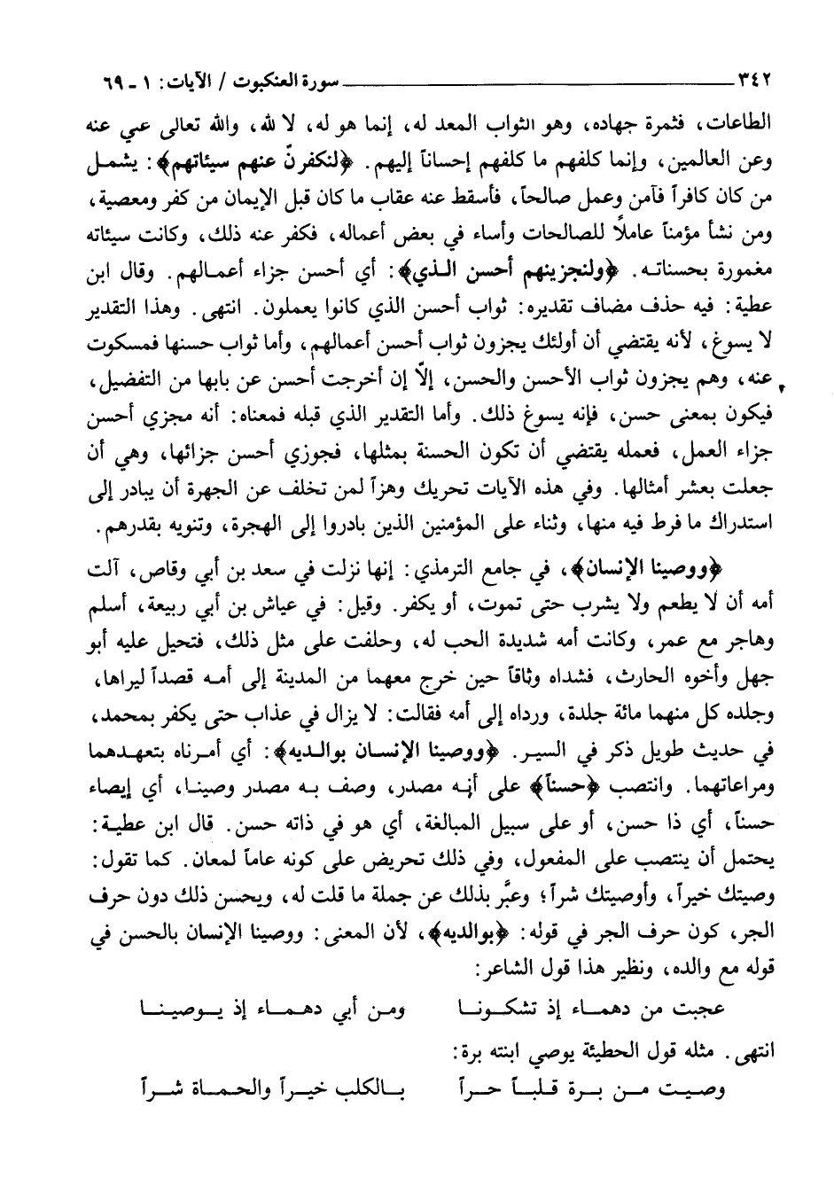 وَوَصَّيْنَا الْإِنْسانَ، فِي جَامِعِ التِّرْمِذِيِّ: إِنَّهَا نَزَلَتْ فِي سَعْدِ بْنِ أَبِي وَقَّاصٍ، آلَتْ أُمُّهُ أَنْ لا يَطْعَمَ وَلَا يَشْرَبَ حَتَّى تَمُوتَ، أَوْ يَكْفُرَ. وَقِيلَ: فِي عَيَّاشِ بْنِ أَبِي رَبِيعَةَ، أَسْلَمَ وَهَاجَرَ مَعَ عُمَرَ، وَكَانَتْ أُمُّهُ شَدِيدَةَ الْحُبِّ لَهُ، وَحَلَفَتْ عَلَى مِثْلِ ذَلِكَ، فَتَحَيَّلَ عَلَيْهِ أَبُو جَهْلٍ وَأَخُوهُ الْحَارِثُ، فَشَدَّاهُ وَثَاقًا حِينَ خَرَجَ مَعَهُمَا مِنَ الْمَدِينَةِ إِلَى أُمِّهِ قَصْدًا لِيَرَاهَا، وَجَلَدَهُ كُلٌّ مِنْهُمَا مِائَةَ جَلْدَةٍ، وَرَدَّاهُ إِلَى أُمِّهِ فَقَالَتْ: لَا يَزَالُ فِي عَذَابٍ حَتَّى يَكْفُرَ بِمُحَمَّدٍ، فِي حَدِيثٍ طَوِيلٍ ذُكِرَ فِي السِّيَرِ. وَوَصَّيْنَا الْإِنْسانَ بِوالِدَيْهِ: أَيْ أَمَرْنَاهُ بِتَعَهُّدِهِمَا وَمُرَاعَاتِهِمَا. وَانْتَصَبَ حُسْناً عَلَى أَنَّهُ مَصْدَرٌ، وُصِفَ بِهِ مَصْدَرُ وَصَّيْنَا، أَيْ إِيصَاءً حُسْنًا، أَيْ ذَا حُسْنٍ، أَوْ عَلَى سَبِيلِ الْمُبَالَغَةِ، أَيْ هُوَ فِي ذَاتِهِ حسن. قَالَ ابْنُ عَطِيَّةَ: