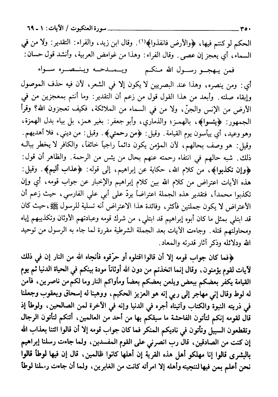 فَما كانَ جَوابَ قَوْمِهِ إِلَّا أَنْ قالُوا اقْتُلُوهُ أَوْ حَرِّقُوهُ فَأَنْجاهُ اللَّهُ مِنَ النَّارِ إِنَّ فِي ذلِكَ لَآياتٍ لِقَوْمٍ يُؤْمِنُونَ، وَقالَ إِنَّمَا اتَّخَذْتُمْ مِنْ دُونِ اللَّهِ أَوْثاناً مَوَدَّةَ بَيْنِكُمْ فِي الْحَياةِ الدُّنْيا ثُمَّ يَوْمَ الْقِيامَةِ يَكْفُرُ بَعْضُكُمْ بِبَعْضٍ وَيَلْعَنُ بَعْضُكُمْ بَعْضاً وَمَأْواكُمُ النَّارُ وَما لَكُمْ مِنْ ناصِرِينَ، فَآمَنَ لَهُ لُوطٌ وَقالَ إِنِّي مُهاجِرٌ إِلى رَبِّي إِنَّهُ هُوَ الْعَزِيزُ الْحَكِيمُ، وَوَهَبْنا لَهُ إِسْحاقَ وَيَعْقُوبَ وَجَعَلْنا فِي ذُرِّيَّتِهِ النُّبُوَّةَ وَالْكِتابَ وَآتَيْناهُ أَجْرَهُ فِي الدُّنْيا وَإِنَّهُ فِي الْآخِرَةِ لَمِنَ الصَّالِحِينَ، وَلُوطاً إِذْ قالَ لِقَوْمِهِ إِنَّكُمْ لَتَأْتُونَ الْفاحِشَةَ مَا سَبَقَكُمْ بِها مِنْ أَحَدٍ مِنَ الْعالَمِينَ، أَإِنَّكُمْ لَتَأْتُونَ الرِّجالَ وَتَقْطَعُونَ السَّبِيلَ وَتَأْتُونَ فِي نادِيكُمُ الْمُنْكَرَ فَما كانَ جَوابَ قَوْمِهِ إِلَّا أَنْ قالُوا ائْتِنا بِعَذابِ اللَّهِ إِنْ كُنْتَ مِنَ الصَّادِقِينَ، قالَ رَبِّ انْصُرْنِي عَلَى الْقَوْمِ الْمُفْسِدِينَ، وَلَمَّا جاءَتْ رُسُلُنا إِبْراهِيمَ بِالْبُشْرى قالُوا إِنَّا مُهْلِكُوا أَهْلِ هذِهِ الْقَرْيَةِ إِنَّ أَهْلَها كانُوا ظالِمِينَ، قالَ إِنَّ فِيها لُوطاً قالُوا نَحْنُ أَعْلَمُ بِمَنْ فِيها لَنُنَجِّيَنَّهُ وَأَهْلَهُ إِلَّا امْرَأَتَهُ كانَتْ مِنَ الْغابِرِينَ، وَلَمَّا أَنْ جاءَتْ رُسُلُنا لُوطاً