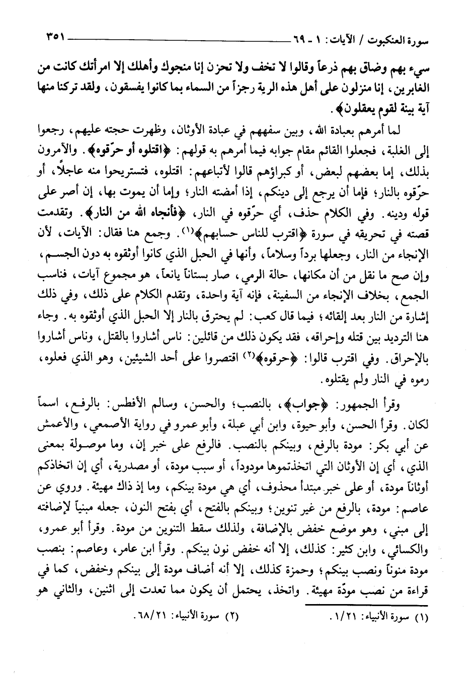 لَمَّا أَمَرَهُمْ بِعِبَادَةِ اللَّهِ، وَبَيَّنَ سَفَهَهُمْ فِي عِبَادَةِ الْأَوْثَانِ، وَظَهَرَتْ حُجَّتُهُ عَلَيْهِمْ، رَجَعُوا إِلَى الْغَلَبَةِ، فَجَعَلُوا الْقَائِمَ مَقَامَ جَوَابِهِ فِيمَا أَمَرَهُمْ بِهِ قَوْلَهُمْ: اقْتُلُوهُ أَوْ حَرِّقُوهُ. وَالْآمِرُونَ بِذَلِكَ، إِمَّا بَعْضُهُمْ لِبَعْضٍ، أَوْ كُبَرَاؤُهُمْ قَالُوا لِأَتْبَاعِهِمُ: اقْتُلُوهُ، فَتَسْتَرِيحُوا مِنْهُ عَاجِلًا، أَوْ حَرِّقُوهُ بِالنَّارِ فَإِمَّا أَنْ يَرْجِعَ إِلَى دِينِكُمْ، إِذَا أَمْضَتْهُ النَّارُ وَإِمَّا أَنْ يَمُوتَ بِهَا، إِنْ أَصَرَّ عَلَى قَوْلِهِ وَدِينِهِ. وَفِي الْكَلَامِ حَذْفٌ، أَيْ حَرِّقُوهُ فِي النَّارِ، فَأَنْجاهُ اللَّهُ مِنَ النَّارِ. وَتَقَدَّمَتْ قِصَّتُهُ فِي تَحْرِيقِهِ فِي سُورَةِ اقْتَرَبَ لِلنَّاسِ حِسابُهُمْ «1» . وَجَمَعَ هُنَا فَقَالَ: الْآيَاتِ، لِأَنَّ الْإِنْجَاءَ مِنَ النَّارِ، وَجَعْلَهَا بَرْدًا وَسَلَامًا، وَأَنَّهَا فِي الْحَبْلِ الَّذِي كَانُوا أَوْثَقُوهُ بِهِ دُونَ الْجِسْمِ، وَإِنْ صَحَّ مَا نُقِلَ مِنْ أَنَّ مَكَانَهَا، حَالَةَ الرَّمْيِ، صَارَ بُسْتَانًا يَانِعًا، هُوَ مَجْمُوعُ آيَاتٍ، فَنَاسَبَ الْجَمْعَ، بِخِلَافِ الْإِنْجَاءِ مِنَ السَّفِينَةِ، فَإِنَّهُ آيَةٌ وَاحِدَةٌ، وَتَقَدَّمَ الْكَلَامُ عَلَى ذَلِكَ، وَفِي ذَلِكَ إِشَارَةٌ مِنَ النَّارِ بَعْدَ إِلْقَائِهِ فِيمَا قَالَ كَعْبٌ: لَمْ يَحْتَرِقْ بِالنَّارِ إِلَّا الْحَبْلُ الَّذِي أَوْثَقُوهُ بِهِ. وَجَاءَ هُنَا التَّرْدِيدُ بَيْنَ قَتْلِهِ وَإِحْرَاقِهِ، فَقَدْ يَكُونُ ذَلِكَ مِنْ قَائِلِينَ: نَاسٌ أَشَارُوا بِالْقَتْلِ، وَنَاسٌ أَشَارُوا بِالْإِحْرَاقِ. وَفِي اقْتَرَبَ قَالُوا: حَرِّقُوهُ «2» اقْتَصَرُوا عَلَى أَحَدِ الشَّيْئَيْنِ، وَهُوَ الَّذِي فَعَلُوهُ، رَمَوْهُ فِي النَّارِ وَلَمْ يَقْتُلُوهُ.
