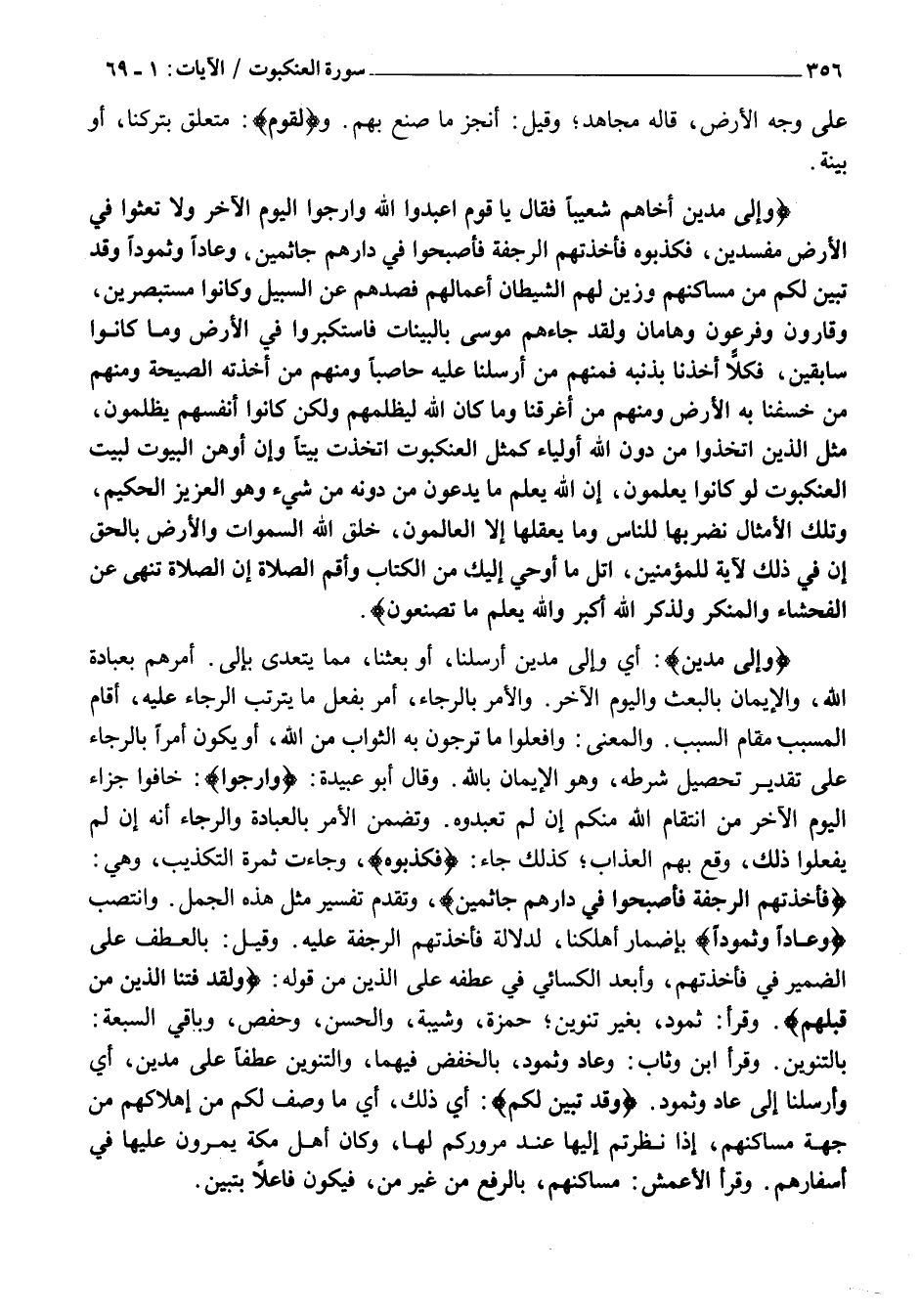 وَإِلى مَدْيَنَ أَخاهُمْ شُعَيْباً فَقالَ يَا قَوْمِ اعْبُدُوا اللَّهَ وَارْجُوا الْيَوْمَ الْآخِرَ وَلا تَعْثَوْا فِي الْأَرْضِ مُفْسِدِينَ، فَكَذَّبُوهُ فَأَخَذَتْهُمُ الرَّجْفَةُ فَأَصْبَحُوا فِي دارِهِمْ جاثِمِينَ، وَعاداً وَثَمُودَ وَقَدْ تَبَيَّنَ لَكُمْ مِنْ مَساكِنِهِمْ وَزَيَّنَ لَهُمُ الشَّيْطانُ أَعْمالَهُمْ فَصَدَّهُمْ عَنِ السَّبِيلِ وَكانُوا مُسْتَبْصِرِينَ، وَقارُونَ وَفِرْعَوْنَ وَهامانَ وَلَقَدْ جاءَهُمْ مُوسى بِالْبَيِّناتِ فَاسْتَكْبَرُوا فِي الْأَرْضِ وَما كانُوا سابِقِينَ، فَكُلًّا أَخَذْنا بِذَنْبِهِ فَمِنْهُمْ مَنْ أَرْسَلْنا عَلَيْهِ حاصِباً وَمِنْهُمْ مَنْ أَخَذَتْهُ الصَّيْحَةُ وَمِنْهُمْ مَنْ خَسَفْنا بِهِ الْأَرْضَ وَمِنْهُمْ مَنْ أَغْرَقْنا وَما كانَ اللَّهُ لِيَظْلِمَهُمْ وَلكِنْ كانُوا أَنْفُسَهُمْ يَظْلِمُونَ، مَثَلُ الَّذِينَ اتَّخَذُوا مِنْ دُونِ اللَّهِ أَوْلِياءَ كَمَثَلِ الْعَنْكَبُوتِ اتَّخَذَتْ بَيْتاً وَإِنَّ أَوْهَنَ الْبُيُوتِ لَبَيْتُ الْعَنْكَبُوتِ لَوْ كانُوا يَعْلَمُونَ، إِنَّ اللَّهَ يَعْلَمُ مَا يَدْعُونَ مِنْ دُونِهِ مِنْ شَيْءٍ وَهُوَ الْعَزِيزُ الْحَكِيمُ، وَتِلْكَ الْأَمْثالُ نَضْرِبُها لِلنَّاسِ وَما يَعْقِلُها إِلَّا الْعالِمُونَ، خَلَقَ اللَّهُ السَّماواتِ وَالْأَرْضَ بِالْحَقِّ إِنَّ فِي ذلِكَ لَآيَةً لِلْمُؤْمِنِينَ، اتْلُ مَا أُوحِيَ إِلَيْكَ مِنَ الْكِتابِ وَأَقِمِ الصَّلاةَ إِنَّ الصَّلاةَ تَنْهى عَنِ الْفَحْشاءِ وَالْمُنْكَرِ وَلَذِكْرُ اللَّهِ أَكْبَرُ وَاللَّهُ يَعْلَمُ مَا تَصْنَعُونَ.