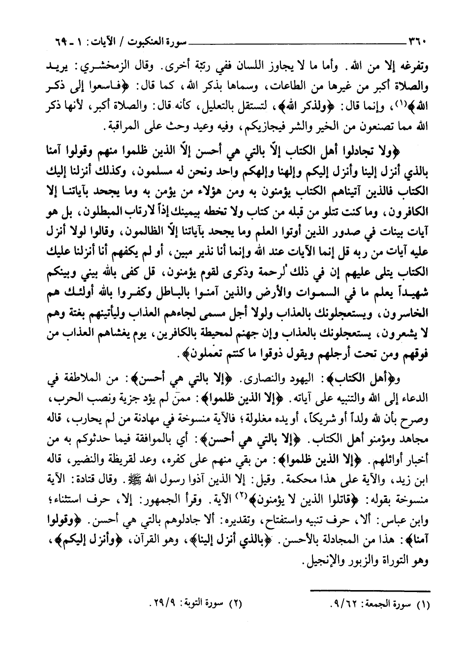 وَلا تُجادِلُوا أَهْلَ الْكِتابِ إِلَّا بِالَّتِي هِيَ أَحْسَنُ إِلَّا الَّذِينَ ظَلَمُوا مِنْهُمْ وَقُولُوا آمَنَّا بِالَّذِي أُنْزِلَ إِلَيْنا وَأُنْزِلَ إِلَيْكُمْ وَإِلهُنا وَإِلهُكُمْ واحِدٌ وَنَحْنُ لَهُ مُسْلِمُونَ، وَكَذلِكَ أَنْزَلْنا إِلَيْكَ الْكِتابَ فَالَّذِينَ آتَيْناهُمُ الْكِتابَ يُؤْمِنُونَ بِهِ وَمِنْ هؤُلاءِ مَنْ يُؤْمِنُ بِهِ وَما يَجْحَدُ بِآياتِنا إِلَّا الْكافِرُونَ، وَما كُنْتَ تَتْلُوا مِنْ قَبْلِهِ مِنْ كِتابٍ وَلا تَخُطُّهُ بِيَمِينِكَ إِذاً لَارْتابَ الْمُبْطِلُونَ، بَلْ هُوَ آياتٌ بَيِّناتٌ فِي صُدُورِ الَّذِينَ أُوتُوا الْعِلْمَ وَما يَجْحَدُ بِآياتِنا إِلَّا الظَّالِمُونَ، وَقالُوا لَوْلا أُنْزِلَ عَلَيْهِ آياتٌ مِنْ رَبِّهِ قُلْ إِنَّمَا الْآياتُ عِنْدَ اللَّهِ وَإِنَّما أَنَا نَذِيرٌ مُبِينٌ، أَوَلَمْ يَكْفِهِمْ أَنَّا أَنْزَلْنا عَلَيْكَ الْكِتابَ يُتْلى عَلَيْهِمْ إِنَّ فِي ذلِكَ لَرَحْمَةً وَذِكْرى لِقَوْمٍ يُؤْمِنُونَ، قُلْ كَفى بِاللَّهِ بَيْنِي وَبَيْنَكُمْ شَهِيداً يَعْلَمُ مَا فِي السَّماواتِ وَالْأَرْضِ وَالَّذِينَ آمَنُوا بِالْباطِلِ وَكَفَرُوا بِاللَّهِ أُولئِكَ هُمُ الْخاسِرُونَ، وَيَسْتَعْجِلُونَكَ بِالْعَذابِ وَلَوْلا أَجَلٌ مُسَمًّى لَجاءَهُمُ الْعَذابُ وَلَيَأْتِيَنَّهُمْ بَغْتَةً وَهُمْ لَا يَشْعُرُونَ، يَسْتَعْجِلُونَكَ بِالْعَذابِ وَإِنَّ جَهَنَّمَ لَمُحِيطَةٌ بِالْكافِرِينَ، يَوْمَ يَغْشاهُمُ الْعَذابُ مِنْ فَوْقِهِمْ وَمِنْ تَحْتِ أَرْجُلِهِمْ وَيَقُولُ ذُوقُوا مَا كُنْتُمْ تَعْمَلُونَ.