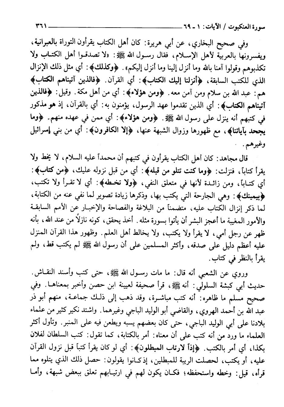 ، وَقَدْ ذَهَبَ إِلَى ذَلِكَ جَمَاعَةٌ، مِنْهُمْ أَبُو ذَرٍّ عَبْدِ اللَّهِ بْنِ أَحْمَدَ الْهَرَوِيُّ، وَالْقَاضِي أَبُو الْوَلِيدِ الْبَاجِيُّ وَغَيْرُهُمَا. وَاشْتَدَّ نَكِيرُ كَثِيرٍ مِنْ عُلَمَاءِ بِلَادِنَا عَلَى أَبِي الْوَلِيدِ الْبَاجِيِّ، حَتَّى كَانَ بَعْضُهُمْ يَسُبُّهُ وَيَطْعَنُ فِيهِ عَلَى الْمِنْبَرِ. وَتَأَوَّلَ أَكْثَرُ الْعُلَمَاءِ مَا وَرَدَ مِنْ أَنَّهُ كَتَبَ عَلَى أَنَّ مَعْنَاهُ: أَمَرَ بِالْكِتَابَةِ، كَمَا تَقُولُ: كَتَبَ السُّلْطَانُ لِفُلَانٍ بِكَذَا، أَيْ أَمَرَ بِالْكَتْبِ. إِذاً لَارْتابَ الْمُبْطِلُونَ: أَيْ لَوْ كَانَ يَقْرَأُ كُتُبًا قَبْلَ نُزُولِ الْقُرْآنِ عَلَيْهِ، أَوْ يَكْتُبُ، لَحَصَلَتِ الريبة للمبطلين، إذ كَانُوا يَقُولُونَ: حَصَلَ ذَلِكَ الَّذِي يَتْلُوهُ مِمَّا قَرَأَهُ، قِيلَ: وَخَطَّهُ وَاسْتَحْفَظَهُ فَكَانَ يَكُونُ لَهُمْ فِي ارْتِيَابِهِمْ تَعَلُّقٌ بِبَعْضِ شُبْهَةٍ، وَأَمَّا