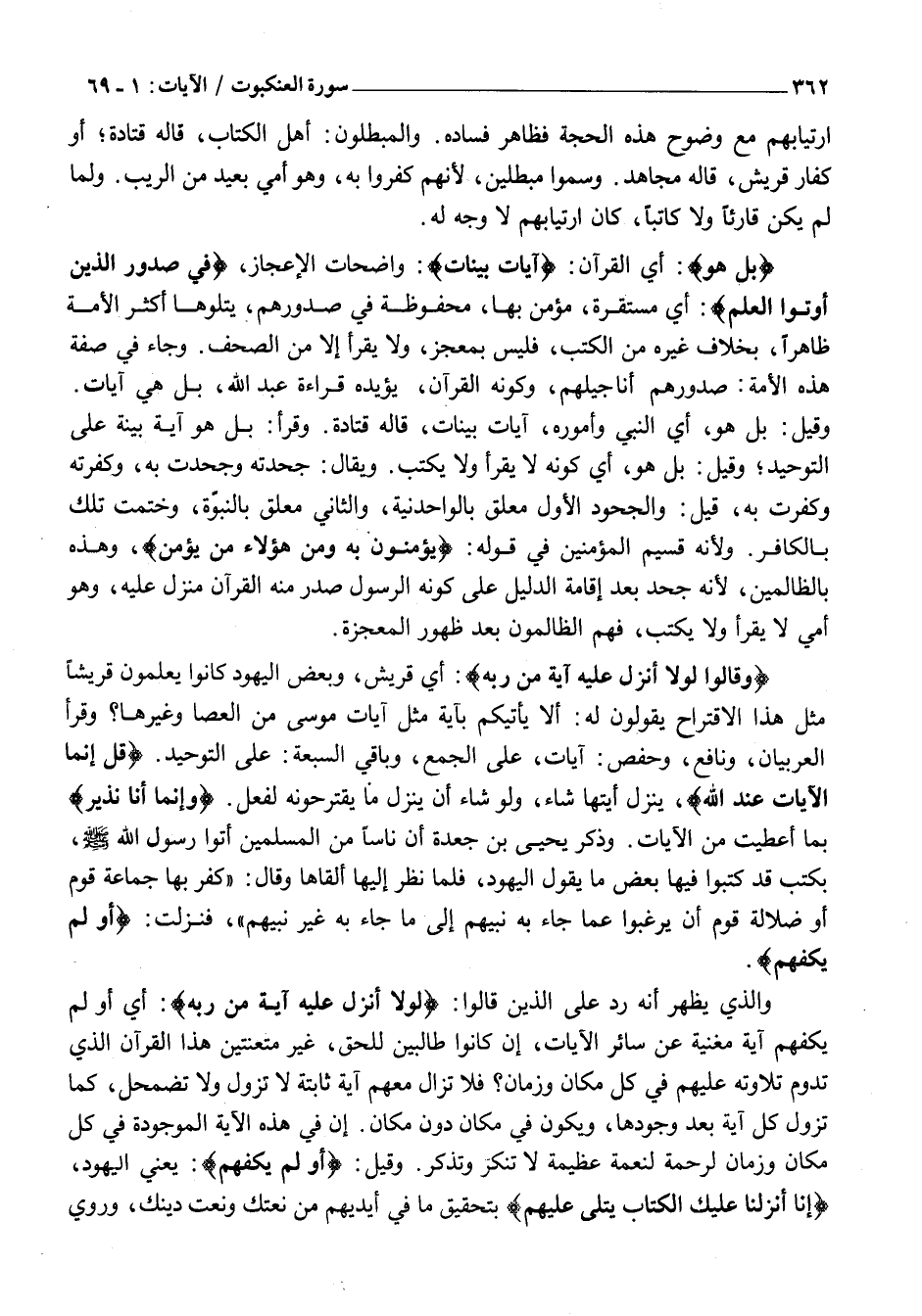 وَالَّذِي يَظْهَرُ أَنَّهُ رَدٌّ عَلَى الَّذِينَ قَالُوا: لَوْلا أُنْزِلَ عَلَيْهِ آياتٌ مِنْ رَبِّهِ: أي أو لم يَكْفِهِمْ آيَةً مُغْنِيَةً عَنْ سَائِرِ الْآيَاتِ، إِنْ كَانُوا طَالِبِينَ لِلْحَقِّ، غَيْرَ مُتَعَنِّتِينَ هَذَا الْقُرْآنُ الَّذِي تَدُومُ تِلَاوَتُهُ عَلَيْهِمْ فِي كُلِّ مَكَانٍ وَزَمَانٍ؟ فَلَا تَزَالُ مَعَهُمْ آيَةٌ ثَابِتَةٌ لَا تَزُولُ وَلَا تَضْمَحِلُّ، كَمَا تَزُولُ كُلُّ آيَةٍ بَعْدَ وُجُودِهَا، وَيَكُونُ فِي مَكَانٍ دُونَ مَكَانٍ. أَنَّ فِي هَذِهِ الْآيَةِ الْمَوْجُودَةِ فِي كُلِّ مَكَانٍ وَزَمَانٍ لَرَحْمَةٌ لَنِعْمَةٌ عَظِيمَةٌ لَا تُنْكَرُ وَتُذْكَرُ. وَقِيلَ: أَوَلَمْ يَكْفِهِمْ: يَعْنِي الْيَهُودَ، أَنَّا أَنْزَلْنا عَلَيْكَ الْكِتابَ يُتْلى عَلَيْهِمْ بِتَحْقِيقِ مَا فِي أَيْدِيهِمْ مِنْ نَعْتِكَ وَنَعْتِ دِينِكَ،
