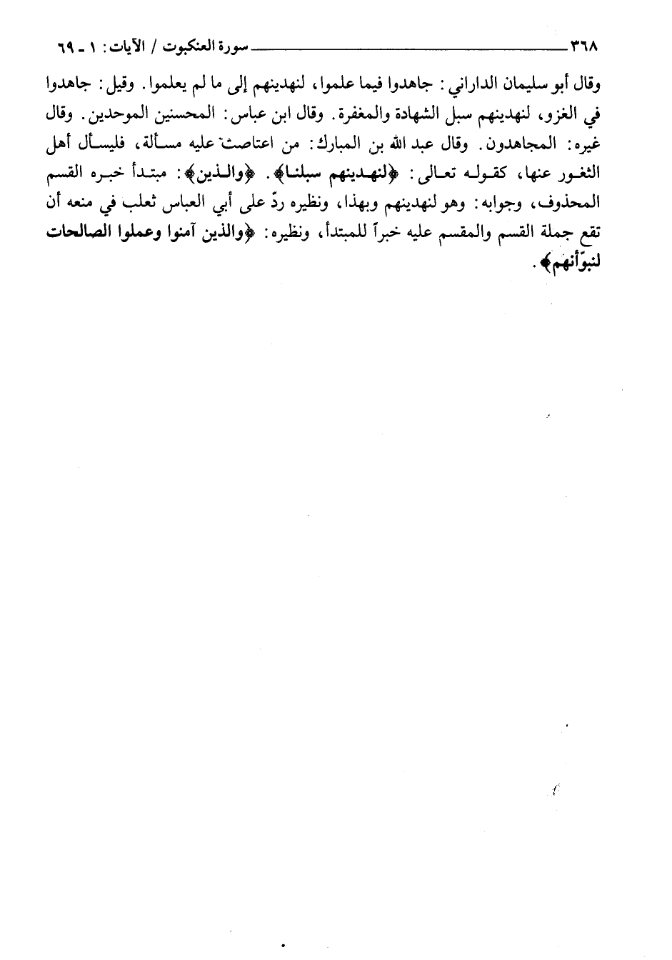 وَقَالَ أَبُو سُلَيْمَانَ الدَّارَانِيُّ: جَاهَدُوا فِيمَا عَلِمُوا، لَنَهْدِيَنَّهُمْ إِلَى مَا لَمْ يَعْلَمُوا. وَقِيلَ: جَاهَدُوا فِي الْغَزْوِ، لَنَهْدِيَنَّهُمْ سُبُلَ الشَّهَادَةِ وَالْمَغْفِرَةِ. وَقَالَ ابْنُ عَبَّاسٍ: الْمُحْسِنِينَ الْمُوَحِّدِينَ. وَقَالَ غَيْرُهُ: الْمُجَاهِدُونَ. وَقَالَ عَبْدُ اللَّهِ بْنُ الْمُبَارَكِ: مَنِ اعْتَاصَتْ عَلَيْهِ مَسْأَلَةٌ، فَلْيَسْأَلْ أَهْلَ الثُّغُورِ عَنْهَا، كَقَوْلِهِ تَعَالَى: لَنَهْدِيَنَّهُمْ سُبُلَنا. وَالَّذِينَ: مُبْتَدَأٌ خَبَرُهُ الْقَسَمِ الْمَحْذُوفِ، وَجَوَابِهِ: وَهُوَ لَنَهْدِيَنَّهُمْ وَبِهَذَا، وَنَظِيرِهِ رُدَّ عَلَى أَبِي الْعَبَّاسِ ثَعْلَبٍ فِي مَنْعِهِ أَنْ تَقَعَ جُمْلَةُ الْقَسَمِ وَالْمُقْسَمِ عَلَيْهِ خَبَرًا لِلْمُبْتَدَأِ، وَنَظِيرُهُ: وَالَّذِينَ آمَنُوا وَعَمِلُوا الصَّالِحاتِ لَنُبَوِّئَنَّهُمْ.