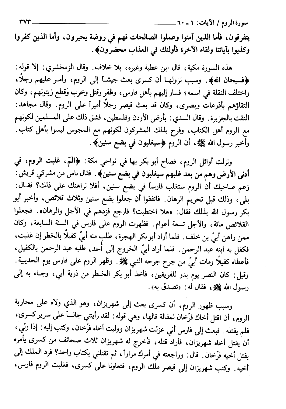 فَسُبْحانَ اللَّهِ. وَسَبَبُ نُزُولِهَا أَنَّ كِسْرَى بَعَثَ جَيْشًا إِلَى الرُّومِ، وَأَمَّرَ عَلَيْهِمْ رَجُلًا، وَاخْتَلَفَ النَّقَلَةُ فِي اسْمِهِ فَسَارَ إِلَيْهِمْ بِأَهْلِ فَارِسَ، وَظَفِرَ وَقَتَلَ وَخَرَّبَ وَقَطَعَ زَيْتُونَهُمْ، وَكَانَ الْتِقَاؤُهُمْ بِأَذْرِعَاتٍ وَبُصْرَى، وَكَانَ قَدْ بَعَثَ قَيْصَرُ رَجُلًا أَمِيرًا عَلَى الرُّومِ. وَقَالَ مُجَاهِدٌ: