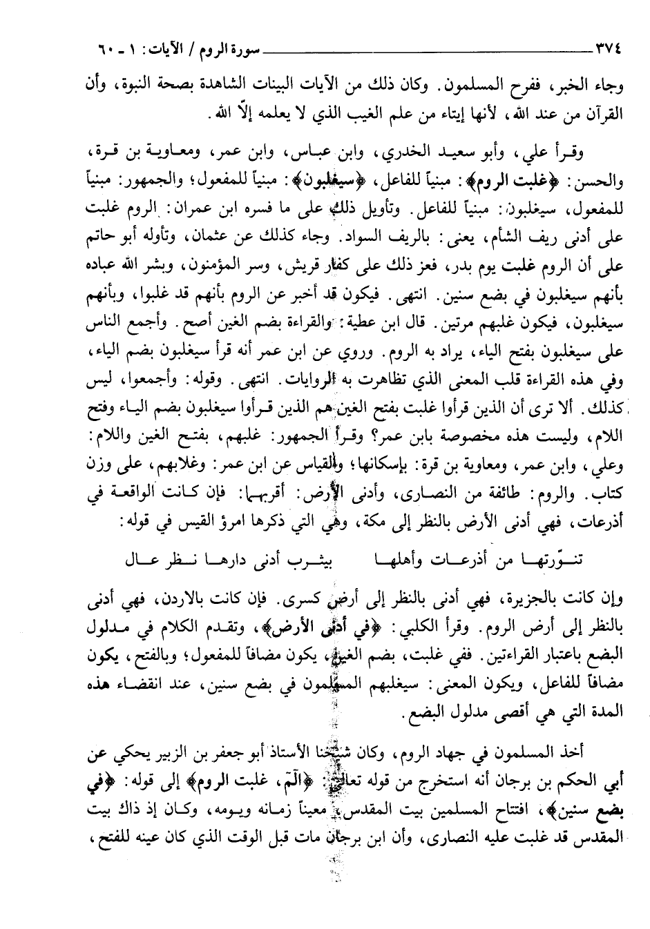 وَإِنْ كَانَتْ بِالْجَزِيرَةِ، فَهِيَ أَدْنَى بِالنَّظَرِ إِلَى أَرْضِ كِسْرَى. فَإِنْ كَانَتْ بِالْأُرْدُنِّ، فَهِيَ أَدْنَى بِالنَّظَرِ إِلَى أَرْضِ الرُّومِ. وَقَرَأَ الْكَلْبِيُّ: فِي أَدْنَى الْأَرْضِ، وَتَقَدَّمَ الْكَلَامُ فِي مَدْلُولِ الْبِضْعِ بِاعْتِبَارِ الْقِرَاءَتَيْنِ. فَفِي غُلِبَتْ، بِضَمِّ الْغَيْنِ، يَكُونُ مُضَافًا لِلْمَفْعُولِ وَبِالْفَتْحِ، يَكُونُ مُضَافًا لِلْفَاعِلِ، وَيَكُونُ الْمَعْنَى: سَيَغْلِبُهُمُ الْمُسْلِمُونَ فِي بِضْعِ سِنِينَ، عِنْدَ انْقِضَاءِ هَذِهِ الْمُدَّةِ الَّتِي هِيَ أَقْصَى مَدْلُولِ الْبِضْعِ.