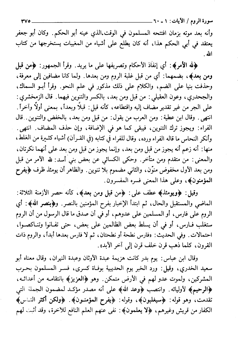 وَقَالَ ابْنُ عَبَّاسٍ: يَوْمَ بَدْرٍ كَانَتْ هَزِيمَةُ عَبْدَةِ الْأَوْثَانِ وَعَبَدَةِ النِّيرَانِ، وَقَالَ مَعْنَاهُ أَبُو سَعِيدٍ الْخُدْرِيُّ، وَقِيلَ: وَرَدَ الْخَبَرُ يَوْمَ الْحُدَيْبِيَةِ بِوَفَاةِ كِسْرَى، فَسُّرَ الْمُسْلِمُونَ بِحَرْبِ الْمُشْرِكِينَ، وَلِمَوْتِ عَدُوٍّ لَهُمْ فِي الْأَرْضِ مُتَمَكِّنٍ. وَهُوَ الْعَزِيزُ بِانْتِقَامِهِ مِنْ أَعْدَائِهِ، الرَّحِيمُ لِأَوْلِيَائِهِ. وَانْتَصَبَ وَعْدَ اللَّهِ عَلَى أَنَّهُ مَصْدَرٌ مُؤَكِّدٌ لِمَضْمُونِ الْجُمْلَةِ الَّتِي تَقَدَّمَتْ، وَهُوَ قَوْلُهُ: سَيَغْلِبُونَ، وَقَوْلُهُ: يَفْرَحُ الْمُؤْمِنُونَ. وَلكِنَّ أَكْثَرَ النَّاسِ الْكُفَّارَ مِنْ قُرَيْشٍ وَغَيْرِهِمْ، لَا يَعْلَمُونَ: نَفَى عَنْهُمُ الْعِلْمَ النَّافِعَ لِلْآخِرَةِ، وَقَدْ أَثْبَتَ لَهُمُ