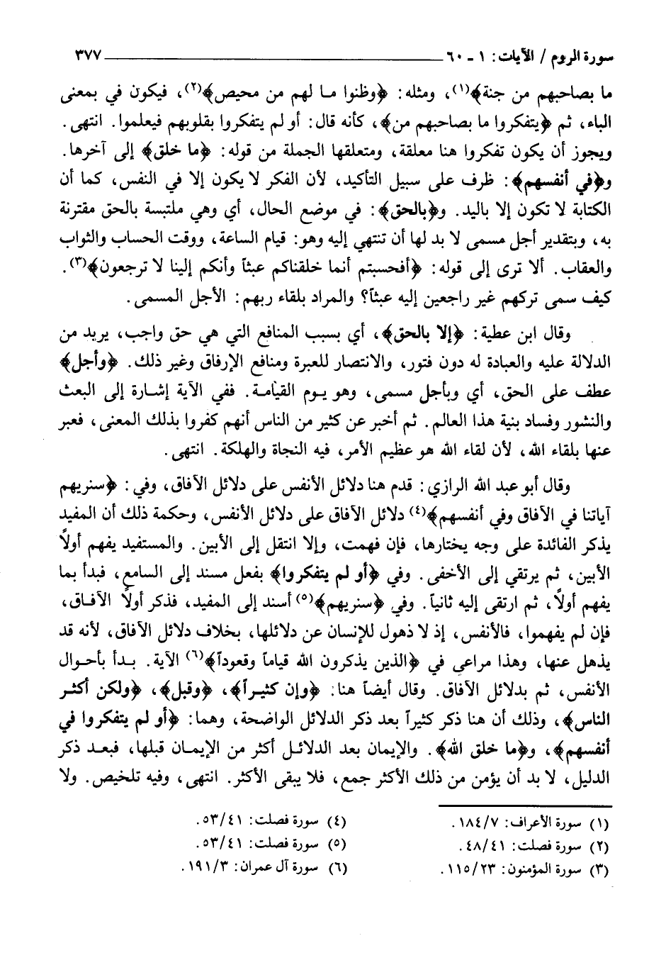 وفِي أَنْفُسِهِمْ: ظَرْفٌ عَلَى سَبِيلِ التَّأْكِيدِ، لِأَنَّ الْفِكْرَ لَا يَكُونُ إِلَّا فِي النَّفْسِ، كَمَا أَنَّ الْكِتَابَةَ لَا تكون إلا باليد. وبِالْحَقِّ: فِي مَوْضِعِ الْحَالِ، أَيْ وَهِيَ مُلْتَبِسَةٌ بِالْحَقِّ مُقْتَرِنَةٌ بِهِ، وَبِتَقْدِيرِ أَجَلٍ مُسَمًّى لَا بُدَّ لَهَا أَنْ تَنْتَهِيَ إِلَيْهِ وَهُوَ: قِيَامُ السَّاعَةِ، وَوَقْتُ الْحِسَابِ وَالثَّوَابِ وَالْعِقَابِ. أَلَا تَرَى إِلَى قَوْلِهِ: أَفَحَسِبْتُمْ أَنَّما خَلَقْناكُمْ عَبَثاً وَأَنَّكُمْ إِلَيْنا لَا تُرْجَعُونَ «3» .
