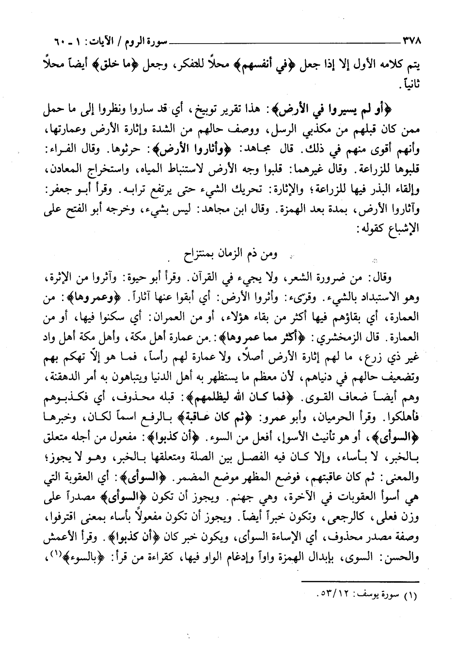 وَمَنْ ذَمَّ الزَّمَانَ بِمُنْتَزَاحٍ وَقَالَ: مِنْ ضَرُورَةِ الشِّعْرِ، وَلَا يَجِيءُ فِي الْقُرْآنِ. وَقَرَأَ أَبُو حَيْوَةَ: وَآثَرُوا مِنَ الْأَثَرَةِ، وَهُوَ الِاسْتِبْدَادُ بِالشَّيْءِ. وقرىء: وَأَثْرُوا الْأَرْضَ: أَيْ أَبْقَوْا عَنْهَا آثَارًا. وَعَمَرُوها: مِنَ الْعِمَارَةِ، أَيْ بَقَاؤُهُمْ فِيهَا أَكْثَرَ مِنْ بَقَاءِ هَؤُلَاءِ، أَوْ مِنَ الْعُمْرَانِ: أَيْ سَكَنُوا فِيهَا، أَوْ مِنَ الْعِمَارَةِ. قَالَ الزَّمَخْشَرِيُّ: أَكْثَرَ مِمَّا عَمَرُوها: مِنْ عِمَارَةِ أَهْلِ مَكَّةَ، وَأَهْلُ مَكَّةَ أَهْلُ وَادٍ غَيْرِ ذِي زَرْعٍ، مَا لَهُمْ إِثَارَةُ الْأَرْضِ أَصْلًا، وَلَا عِمَارَةَ لَهُمْ رَأْسًا، فَمَا هُوَ إِلَّا تَهَكُّمٌ بِهِمْ وَتَضْعِيفُ حَالِهِمْ فِي دُنْيَاهُمْ، لِأَنَّ مُعْظَمَ مَا يَسْتَظْهِرُ بِهِ أَهْلُ الدُّنْيَا وَيَتَبَاهَوْنَ بِهِ أَمْرُ الدَّهْقَنَةِ، وَهُمْ أَيْضًا ضِعَافُ الْقُوَى. فَما كانَ اللَّهُ لِيَظْلِمَهُمْ: قَبْلَهُ مَحْذُوفٌ، أَيْ فَكَذَّبُوهُمْ فَأُهْلِكُوا. وَقَرَأَ الْحَرَمِيَّانِ، وَأَبُو عَمْرٍو: ثُمَّ كانَ عاقِبَةَ بِالرَّفْعِ اسْمًا لكان، وخبرها السُّواى، أَوْ هُوَ تَأْنِيثُ الْأَسْوَأِ، افْعَلْ مِنَ السُّوءِ. أَنْ كَذَّبُوا: مَفْعُولٌ مِنْ أَجْلِهِ متعلق بالخبر، لا بأساء، وَإِلَّا كَانَ فِيهِ الْفَصْلُ بَيْنَ الصِّلَةِ وَمُتَعَلِّقِهَا بِالْخَبَرِ، وَهُوَ لَا يَجُوزُ وَالْمَعْنَى: ثُمَّ كَانَ عَاقِبَتَهُمْ، فَوَضَعَ الْمُظْهَرَ مَوْضِعَ الْمُضْمَرِ. السُّواى: أَيِ الْعُقُوبَةُ الَّتِي هِيَ أَسْوَأُ الْعُقُوبَاتِ فِي الْآخِرَةِ، وَهِيَ جَهَنَّمَ. وَيَجُوزُ أَنْ تَكُونَ السُّواى مصدرا على وزن فعلى، كَالرُّجْعَى، وَتَكُونُ خَبَرًا أَيْضًا. وَيَجُوزُ أَنْ تَكُونَ مَفْعُولًا بأساء بِمَعْنَى اقْتَرَفُوا، وَصِفَةَ مَصْدَرٍ محذوف، أي الإساءة السوأى، وَيَكُونُ خَبَرُ كَانَ أَنْ كَذَّبُوا. وَقَرَأَ الْأَعْمَشُ وَالْحَسَنُ: السُّوَّى، بِإِبْدَالِ الْهَمْزَةِ وَاوًا وَإِدْغَامِ الْوَاوِ فِيهَا، كَقِرَاءَةِ من قرأ: بِالسُّوءِ «1» ،