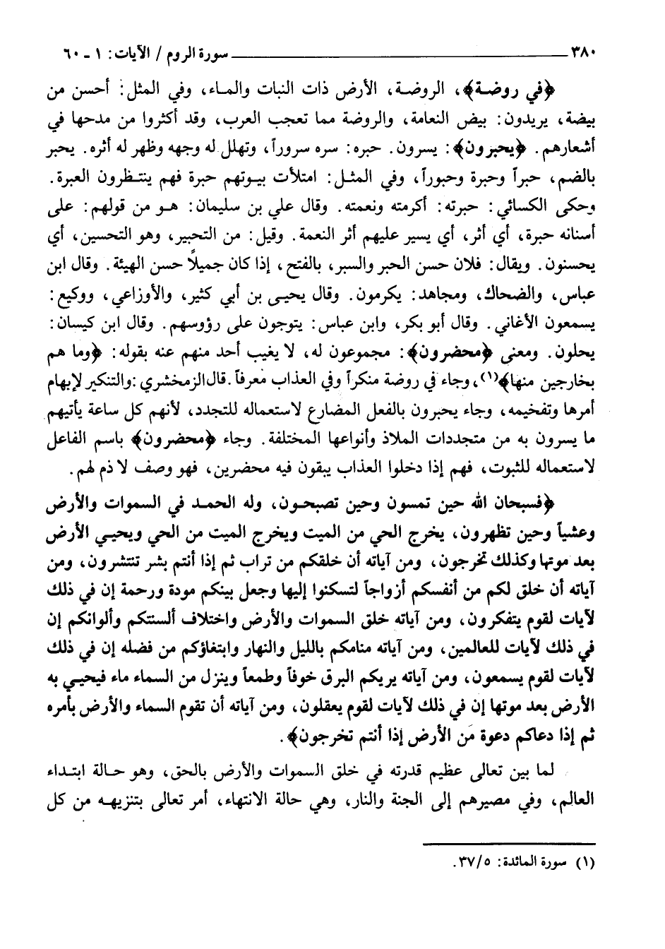 فِي رَوْضَةٍ، الرَّوْضَةُ، الْأَرْضُ ذَاتُ النَّبَاتِ وَالْمَاءِ، وَفِي الْمَثَلِ: أَحْسَنُ مِنْ بَيْضَةٍ، يُرِيدُونَ: بَيْضَ النَّعَامَةِ، وَالرَّوْضَةُ مِمَّا تُعْجِبُ الْعَرَبَ، وَقَدْ أَكْثَرُوا مِنْ مَدْحِهَا فِي أَشْعَارِهِمْ. يُحْبَرُونَ: يُسَرُّونَ. حَبَرَهُ: سَرَّهُ سُرُورًا، وَتَهَلَّلَ لَهُ وَجْهُهُ وَظَهَرَ لَهُ أَثَرُهُ. يَحْبُرُ بِالضَّمِّ، حَبْرًا وَحَبْرَةً وَحُبُورًا، وَفِي الْمَثَلِ: امْتَلَأَتْ بُيُوتُهُمْ حَبْرَةً فَهُمْ يَنْتَظِرُونَ الْعَبْرَةَ.