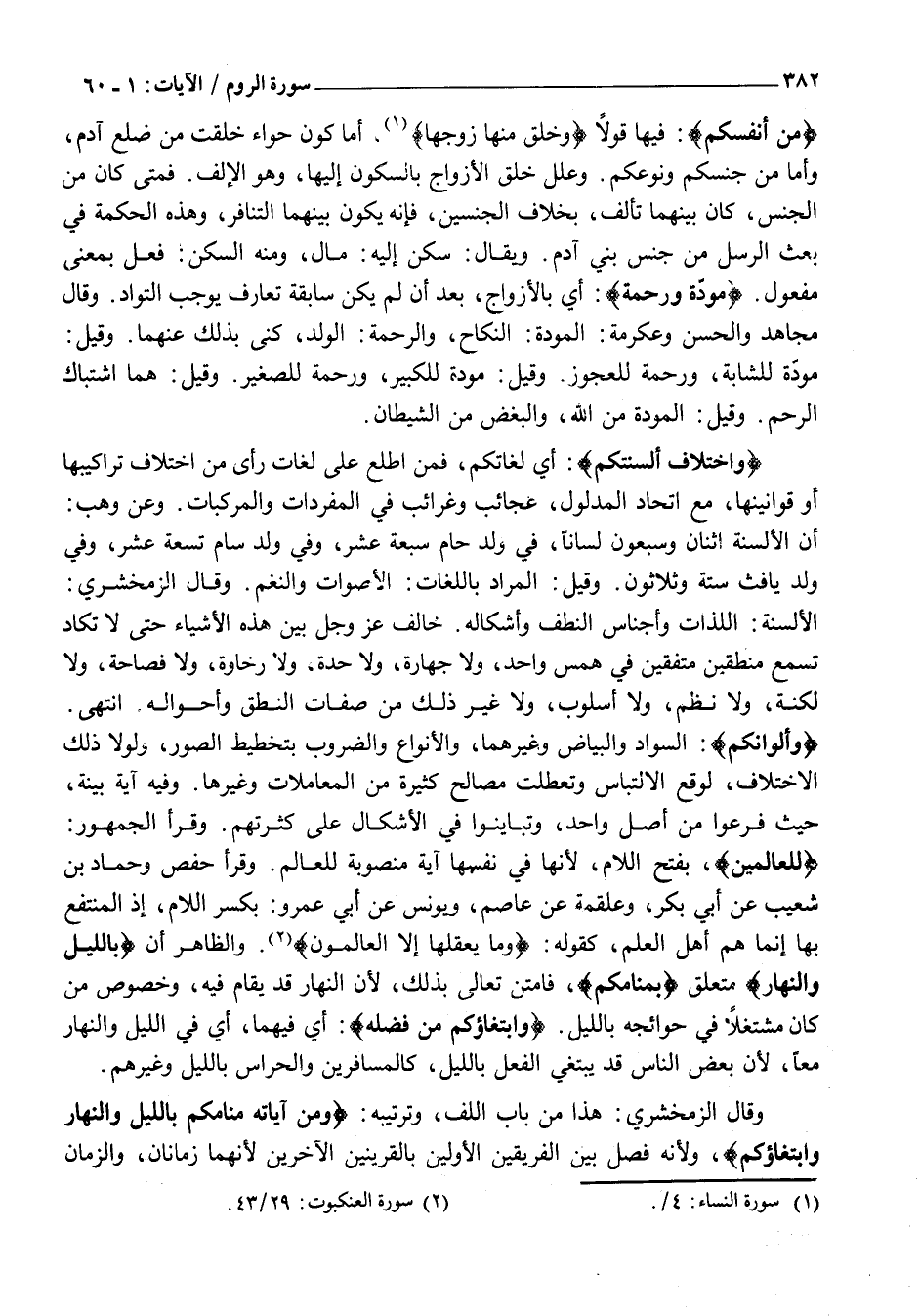 الْأَلْسِنَةُ: اللَّذَّاتُ وَأَجْنَاسُ النُّطَفِ وَأَشْكَالُهُ. خَالَفَ عَزَّ وَجَلَّ بَيْنَ هَذِهِ الْأَشْيَاءِ حَتَّى لَا تَكَادَ تَسْمَعُ مَنْطِقَيْنِ مُتَّفِقَيْنِ فِي هَمْسٍ وَاحِدٍ، وَلَا جَهَارَةٍ، وَلَا حِدَّةٍ، وَلَا رَخَاوَةٍ، وَلَا فَصَاحَةٍ، وَلَا لُكْنَةٍ، وَلَا نَظْمٍ، وَلَا أُسْلُوبٍ، وَلَا غَيْرِ ذَلِكَ مِنْ صِفَاتِ النُّطْقِ وَأَحْوَالِهِ. انْتَهَى.