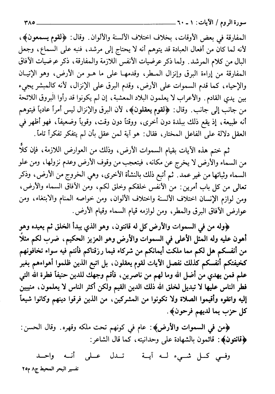 الْمُفَارَقَةِ فِي بَعْضِ الْأَوْقَاتِ، بِخِلَافِ اخْتِلَافِ الْأَلْسِنَةِ وَالْأَلْوَانِ. وَقَالَ: لِقَوْمٍ يَسْمَعُونَ، لِأَنَّهُ لَمَّا كَانَ مِنْ أَفْعَالِ الْعِبَادَةِ قَدْ يُتَوَهَّمُ أَنَّهُ لَا يُحْتَاجُ إِلَى مُرْشِدٍ، فَنَبَّهَ عَلَى السَّمَاعِ، وَجَعَلَ الْبَالَ مِنْ كَلَامِ الْمُرْشِدِ. وَلَمَّا ذَكَرَ عَرَضِيَّاتِ الْأَنْفُسِ اللَّازِمَةَ وَالْمُفَارِقَةَ، ذَكَرَ عَرَضِيَّاتِ الْآفَاقِ الْمُفَارِقَةَ مِنْ إِرَاءَةِ الْبَرْقِ وَإِنْزَالِ الْمَطَرِ، وَقَدَّمَهَا عَلَى مَا هُوَ مِنَ الْأَرْضِ، وَهُوَ الْإِتْيَانُ وَالْإِحْيَاءُ، كما قدم السموات عَلَى الْأَرْضِ، وَقَدَّمَ الْبَرْقَ عَلَى الْإِنْزَالِ، لِأَنَّهُ كَالْمُبَشِّرِ يَجِيءُ بَيْنَ يَدَيِ الْقَادِمِ. وَالْأَعْرَابُ لَا يَعْلَمُونَ الْبِلَادَ الْمُعْشِبَةَ، إِنْ لَمْ يَكُونُوا قَدْ رَأَوُا الْبُرُوقَ اللَّائِحَةَ مِنْ جَانِبٍ إِلَى جَانِبٍ. وَقَالَ: لِقَوْمٍ يَعْقِلُونَ، لِأَنَّ الْبَرْقَ وَالْإِنْزَالَ لَيْسَ أَمْرًا عَادِيًّا فَيَتَوَهَّمُ أَنَّهُ طَبِيعَةٌ، إِذْ يَقَعُ ذَلِكَ بِبَلْدَةٍ دُونَ أُخْرَى، وَوَقْتًا دُونَ وَقْتٍ، وَقَوِيًّا وَضَعِيفًا، فَهُوَ أَظْهَرُ فِي الْعَقْلِ دَلَالَةً عَلَى الْفَاعِلِ الْمُخْتَارِ، فَقَالَ: هُوَ آيَةٌ لِمَنْ عَقَلَ بِأَنْ لَمْ يَتَفَكَّرْ تَفَكُّرًا تَامًّا.