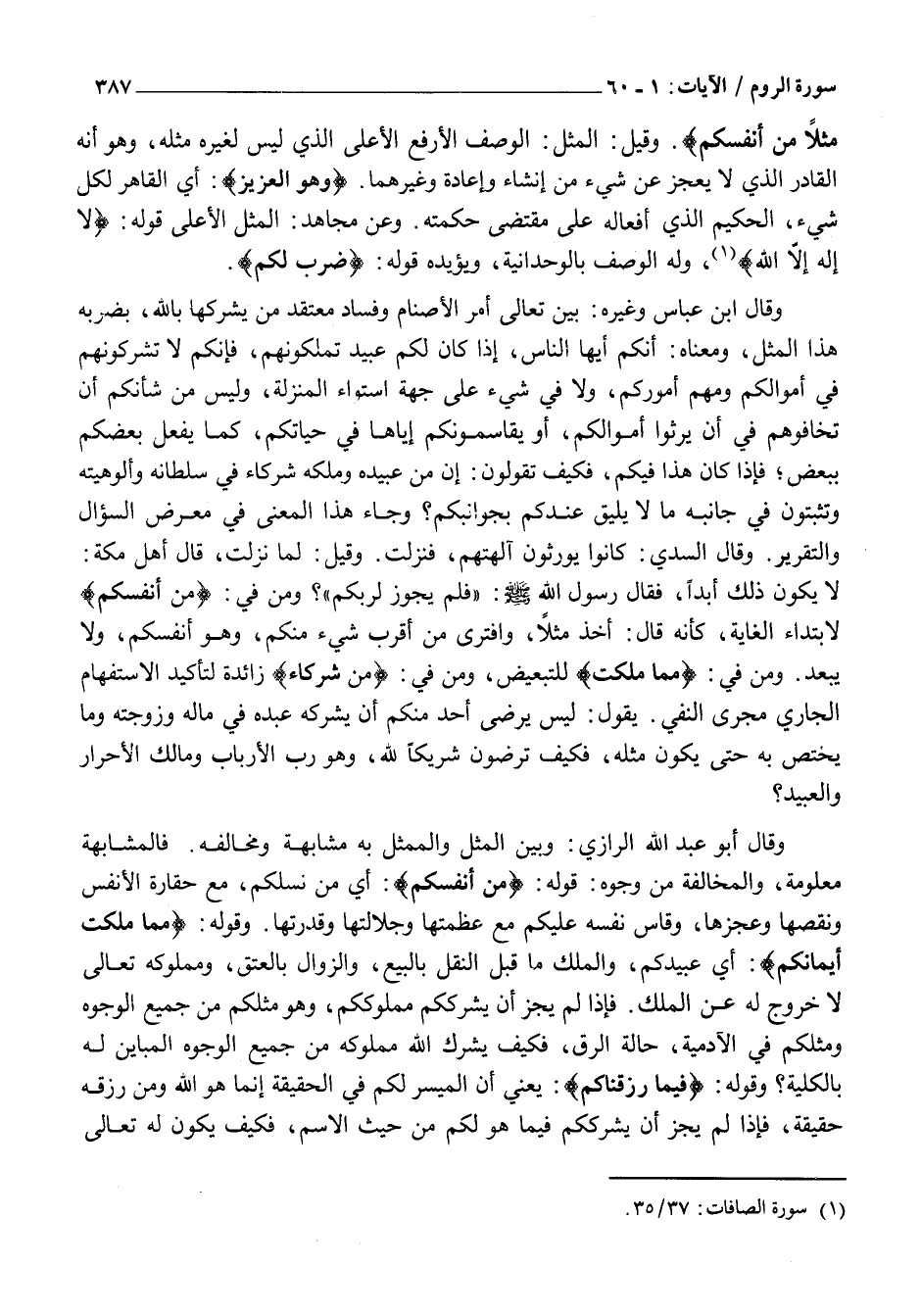 وَقَالَ أَبُو عَبْدِ اللَّهِ الرَّازِيُّ: وَبَيْنَ الْمَثَلِ وَالْمُمَثَّلِ بِهِ مُشَابَهَةٌ وَمُخَالَفَةٌ. فَالْمُشَابَهَةُ مَعْلُومَةٌ، وَالْمُخَالَفَةُ مِنْ وُجُوهٍ: قَوْلُهُ: مِنْ أَنْفُسِكُمْ: أَيْ مِنْ نَسْلِكُمْ، مَعَ حَقَارَةِ الْأَنْفُسِ وَنَقْصِهَا وَعَجْزِهَا، وَقَاسَ نَفْسَهُ عَلَيْكُمْ مَعَ عَظْمَتِهَا وَجَلَالَتِهَا وَقُدْرَتِهَا. وَقَوْلُهُ: مِمَّا مَلَكَتْ أَيْمانُكُمْ: أَيْ عَبِيدِكُمْ، وَالْمِلْكُ مَا قَبَلَ النَّقْلَ بِالْبَيْعِ، وَالزَّوَالَ بِالْعِتْقِ، وَمَمْلُوكُهُ تَعَالَى لَا خُرُوجَ لَهُ عَنِ الْمِلْكِ. فَإِذَا لَمْ يَجُزْ أَنْ يَشْرَكَكُمْ مَمْلُوكُكُمْ، وَهُوَ مِثْلُكُمْ مِنْ جَمِيعِ الْوُجُوهِ وَمِثْلُكُمْ فِي الْآدَمِيَّةِ، حَالَةَ الرِّقِّ، فَكَيْفَ يَشْرَكُ اللَّهَ مَمْلُوكُهُ مِنْ جَمِيعِ الْوُجُوهِ الْمُبَايِنَ لَهُ بِالْكُلِّيَّةِ؟ وقوله: فِي ما رَزَقْناكُمْ: يَعْنِي أَنَّ الْمُيَسِّرَ لَكُمْ فِي الْحَقِيقَةِ إِنَّمَا هُوَ اللَّهُ وَمِنْ رِزْقِهِ حَقِيقَةً، فَإِذَا لَمْ يَجُزْ أَنْ يَشْرِكَكُمْ فِيمَا هُوَ لَكُمْ مِنْ حَيْثُ الِاسْمِ، فَكَيْفَ يَكُونُ لَهُ تَعَالَى