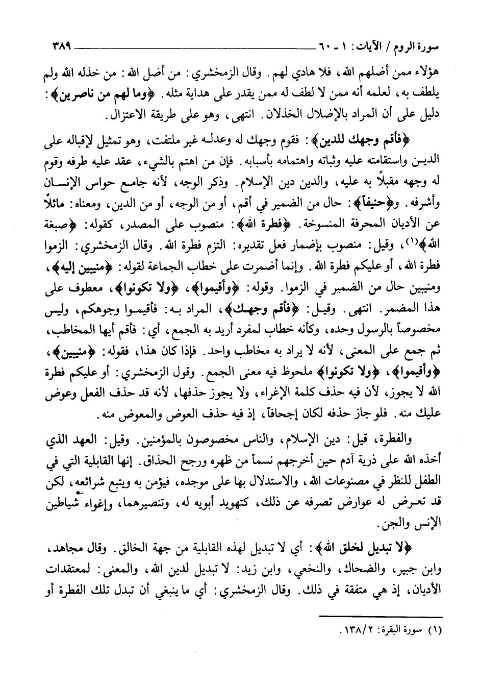 وَالْفِطْرَةُ، قِيلَ: دِينُ الإسلام، والناس مَخْصُوصُونَ بِالْمُؤْمِنِينَ. وَقِيلَ: الْعَهْدُ الَّذِي أَخَذَهُ اللَّهُ عَلَى ذُرِّيَّةِ آدَمَ حِينَ أَخْرَجَهُمْ نَسَمًا مِنْ ظَهْرِهِ وَرَجَّحَ الْحُذَّاقُ. أَنَّهَا الْقَابِلِيَّةُ الَّتِي فِي الطِّفْلِ لِلنَّظَرِ فِي مَصْنُوعَاتِ اللَّهِ، وَالِاسْتِدْلَالِ بِهَا عَلَى مُوجِدِهِ، فَيُؤْمِنُ بِهِ وَيَتَّبِعُ شَرَائِعَهُ، لَكِنْ قَدْ تَعْرِضُ لَهُ عَوَارِضُ تَصْرِفُهُ عَنْ ذَلِكَ، كَتَهْوِيدِ أَبَوَيْهِ لَهُ، وَتَنْصِيرِهِمَا، وَإِغْوَاءِ شَيَاطِينِ الْإِنْسِ وَالْجِنِّ.