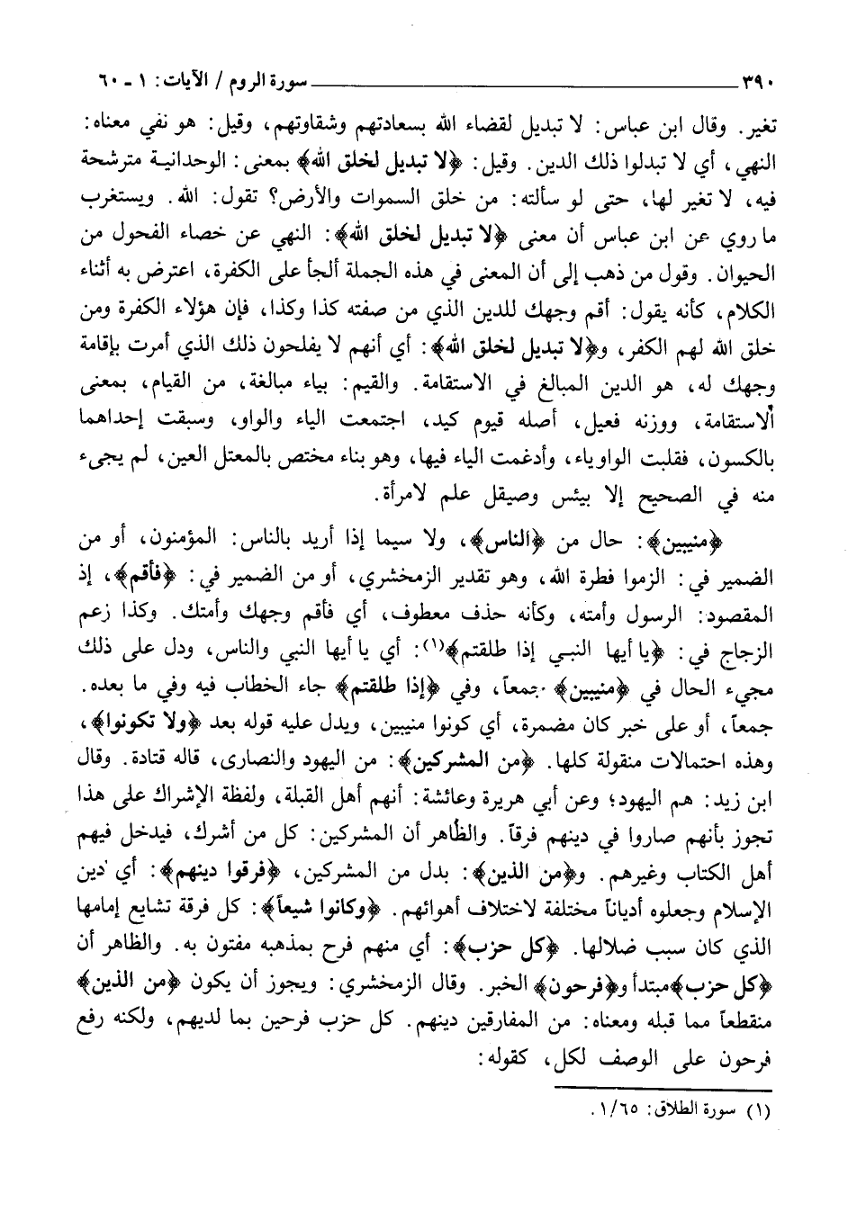 جَمْعًا، أَوْ عَلَى خَبَرُ كَانَ مُضْمَرَةً، أَيْ كُونُوا مُنِيبِينَ، وَيَدُلُّ عَلَيْهِ قَوْلُهُ بَعْدَ وَلا تَكُونُوا، وَهَذِهِ احْتِمَالَاتٌ مَنْقُولَةٌ كُلُّهَا. مِنَ الْمُشْرِكِينَ: مِنَ الْيَهُودِ وَالنَّصَارَى، قَالَهُ قَتَادَةُ. وَقَالَ ابْنُ زَيْدٍ: هُمُ الْيَهُودُ وَعَنْ أَبِي هُرَيْرَةَ وَعَائِشَةَ: أَنَّهُمْ أَهْلُ الْقِبْلَةِ، وَلَفْظَةُ الْإِشْرَاكِ عَلَى هَذَا تَجُوزُ بِأَنَّهُمْ صَارُوا فِي دِينِهِمْ فِرَقًا. وَالظَّاهِرُ أَنَّ الْمُشْرِكِينَ: كُلٌّ مَنْ أَشْرَكَ، فَيَدْخُلُ فِيهِمْ أَهْلُ الكتاب وغيرهم. ومِنَ الَّذِينَ: بَدَلٌ مِنَ الْمُشْرِكِينَ، فَرَّقُوا دِينَهُمْ: أَيْ دِينَ الْإِسْلَامِ وَجَعَلُوهُ أَدْيَانًا مُخْتَلِفَةً لِاخْتِلَافِ أَهْوَائِهِمْ. وَكانُوا شِيَعاً: كُلُّ فِرْقَةٍ تُشَايِعُ إِمَامَهَا الَّذِي كَانَ سَبَبَ ضَلَالِهَا. كُلُّ حِزْبٍ: أَيْ مِنْهُمْ فَرِحٌ بِمَذْهَبِهِ مَفْتُونٌ بِهِ. وَالظَّاهِرُ أَنَّ كُلُّ حِزْبٍ مبتدأ وفَرِحُونَ الْخَبَرُ. وَقَالَ الزَّمَخْشَرِيُّ: وَيَجُوزُ أَنْ يَكُونَ مِنَ الَّذِينَ مُنْقَطِعًا مِمَّا قَبْلَهُ وَمَعْنَاهُ: مِنَ الْمُفَارِقِينَ دِينَهُمْ. كُلُّ حِزْبٍ فَرِحِينَ بِمَا لَدَيْهِمْ، وَلَكِنَّهُ رَفَعَ فَرِحُونَ عَلَى الوصف لكل، كقوله: