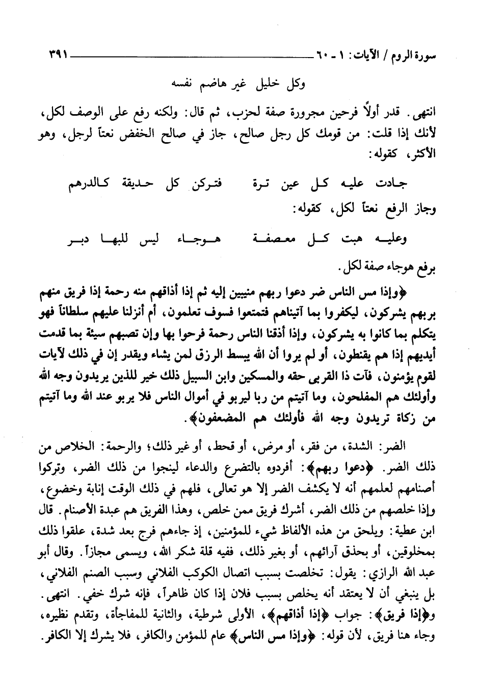 وَإِذا مَسَّ النَّاسَ ضُرٌّ دَعَوْا رَبَّهُمْ مُنِيبِينَ إِلَيْهِ ثُمَّ إِذا أَذاقَهُمْ مِنْهُ رَحْمَةً إِذا فَرِيقٌ مِنْهُمْ بِرَبِّهِمْ يُشْرِكُونَ، لِيَكْفُرُوا بِما آتَيْناهُمْ فَتَمَتَّعُوا فَسَوْفَ تَعْلَمُونَ، أَمْ أَنْزَلْنا عَلَيْهِمْ سُلْطاناً فَهُوَ يَتَكَلَّمُ بِما كانُوا بِهِ يُشْرِكُونَ، وَإِذا أَذَقْنَا النَّاسَ رَحْمَةً فَرِحُوا بِها وَإِنْ تُصِبْهُمْ سَيِّئَةٌ بِما قَدَّمَتْ أَيْدِيهِمْ إِذا هُمْ يَقْنَطُونَ، أَوَلَمْ يَرَوْا أَنَّ اللَّهَ يَبْسُطُ الرِّزْقَ لِمَنْ يَشاءُ وَيَقْدِرُ إِنَّ فِي ذلِكَ لَآياتٍ لِقَوْمٍ يُؤْمِنُونَ، فَآتِ ذَا الْقُرْبى حَقَّهُ وَالْمِسْكِينَ وَابْنَ السَّبِيلِ ذلِكَ خَيْرٌ لِلَّذِينَ يُرِيدُونَ وَجْهَ اللَّهِ وَأُولئِكَ هُمُ الْمُفْلِحُونَ، وَما آتَيْتُمْ مِنْ رِباً لِيَرْبُوَا فِي أَمْوالِ النَّاسِ فَلا يَرْبُوا عِنْدَ اللَّهِ وَما آتَيْتُمْ مِنْ زَكاةٍ تُرِيدُونَ وَجْهَ اللَّهِ فَأُولئِكَ هُمُ الْمُضْعِفُونَ.
