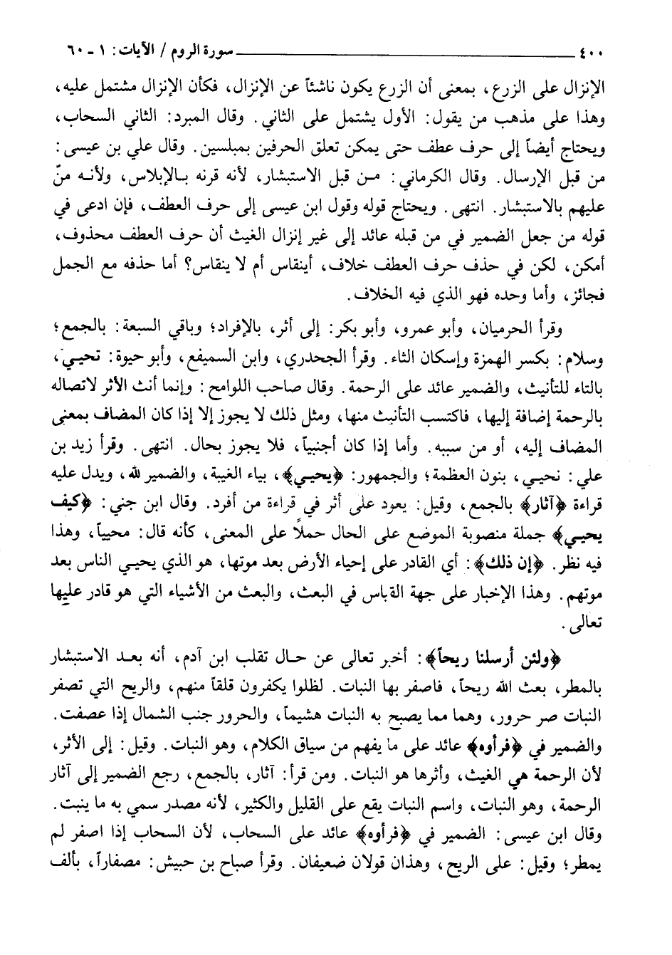 وَقَرَأَ الْحَرَمِيَّانِ، وَأَبُو عَمْرٍو، وَأَبُو بَكْرٍ: إِلَى أَثَرِ، بِالْإِفْرَادِ وَبَاقِي السَّبْعَةِ: بِالْجَمْعِ وَسَلَامٌ: بِكَسْرِ الْهَمْزَةِ وَإِسْكَانِ الثَّاءِ. وقرأ الجحدري، وابن السميفع، وَأَبُو حَيْوَةَ: تُحْيِي، بِالتَّاءِ لِلتَّأْنِيثِ، وَالضَّمِيرُ عَائِدٌ عَلَى الرَّحْمَةِ. وَقَالَ صَاحِبُ اللَّوَامِحِ: وَإِنَّمَا أَنَّثَ الْأَثَرَ لِاتِّصَالِهِ بِالرَّحْمَةِ إِضَافَةً إِلَيْهَا، فَاكْتَسَبَ التَّأْنِيثَ مِنْهَا، وَمِثْلُ ذَلِكَ لَا يَجُوزُ إِلَّا إِذَا كَانَ الْمُضَافُ بِمَعْنَى الْمُضَافِ إِلَيْهِ، أَوْ مِنْ سَبَبِهِ. وَأَمَّا إِذَا كَانَ أَجْنَبِيًّا، فَلَا يَجُوزُ بِحَالٍ. انْتَهَى. وَقَرَأَ زَيْدُ بْنُ عَلِيٍّ: نُحْيِي، بِنُونِ الْعَظْمَةِ وَالْجُمْهُورُ: يُحْيِ، بِيَاءِ الْغَيْبَةِ، وَالضَّمِيرُ لِلَّهِ، وَيَدُلُّ عَلَيْهِ قِرَاءَةُ آثارِ بِالْجَمْعِ، وَقِيلَ: يَعُودُ عَلَى أَثَرِ فِي قِرَاءَةِ مَنْ أَفْرَدَ. وَقَالَ ابْنُ جِنِّي: كَيْفَ يُحْيِ جُمْلَةٌ مَنْصُوبَةُ الْمَوْضِعِ عَلَى الْحَالِ حَمْلًا عَلَى الْمَعْنَى، كَأَنَّهُ قَالَ: مُحْيِيًا، وَهَذَا فِيهِ نَظَرٌ. إِنَّ ذلِكَ: أَيِ الْقَادِرُ عَلَى إِحْيَاءَ الْأَرْضِ بَعْدَ مَوْتِهَا، هُوَ الَّذِي يُحْيِي النَّاسَ بَعْدَ مَوْتِهِمْ. وَهَذَا الْإِخْبَارُ عَلَى جِهَةِ الْقِيَاسِ فِي الْبَعْثِ، وَالْبَعْثُ مِنَ الْأَشْيَاءِ الَّتِي هُوَ قَادِرٌ عَلَيْهَا تَعَالَى.