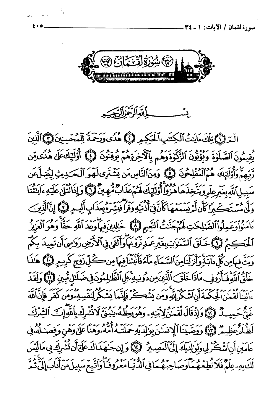 الم (1) تِلْكَ آياتُ الْكِتابِ الْحَكِيمِ (2) هُدىً وَرَحْمَةً لِلْمُحْسِنِينَ (3) الَّذِينَ يُقِيمُونَ الصَّلاةَ وَيُؤْتُونَ الزَّكاةَ وَهُمْ بِالْآخِرَةِ هُمْ يُوقِنُونَ (4)