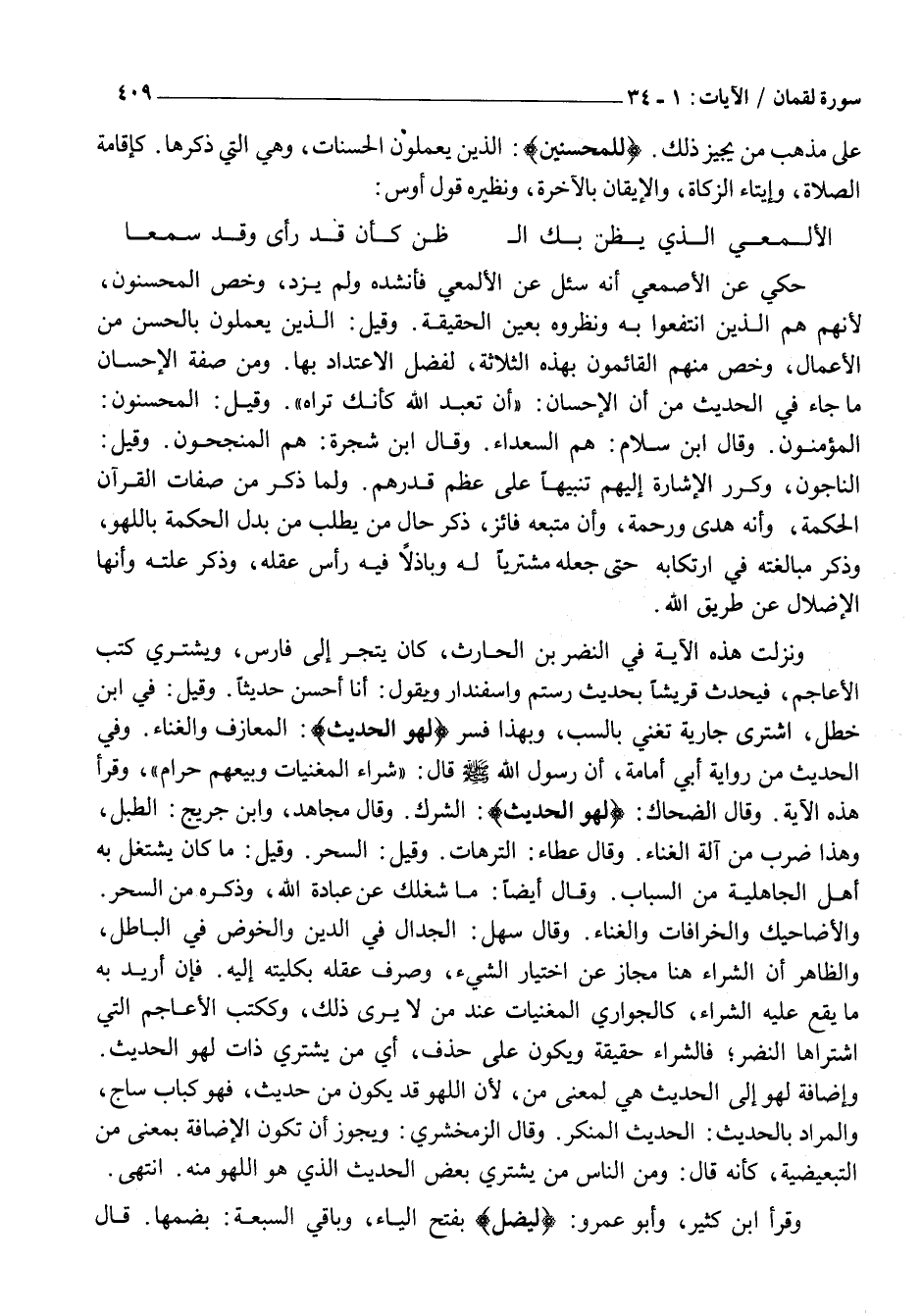 وَالْأَضَاحِيكِ وَالْخُرَافَاتِ وَالْغِنَاءِ. وَقَالَ سَهْلٌ: الْجِدَالُ فِي الدِّينِ وَالْخَوْضُ فِي الْبَاطِلِ، وَالظَّاهِرُ أَنَّ الشِّرَاءَ هُنَا مَجَازٌ عَنِ اخْتِيَارِ الشَّيْءِ، وَصَرْفِ عَقْلِهِ بِكُلِّيَّتِهِ إِلَيْهِ. فَإِنْ أُرِيدَ بِهِ مَا يَقَعُ عَلَيْهِ الشِّرَاءُ، كَالْجَوَارِي الْمُغَنِّيَاتِ عِنْدَ مَنْ لَا يَرَى ذَلِكَ، وَكَكُتُبِ الْأَعَاجِمِ الَّتِي اشْتَرَاهَا النَّضْرُ فَالشِّرَاءُ حَقِيقَةٌ وَيَكُونُ عَلَى حَذْفٍ، أَيْ مَنْ يَشْتَرِي ذَاتَ لَهْوِ الْحَدِيثِ.