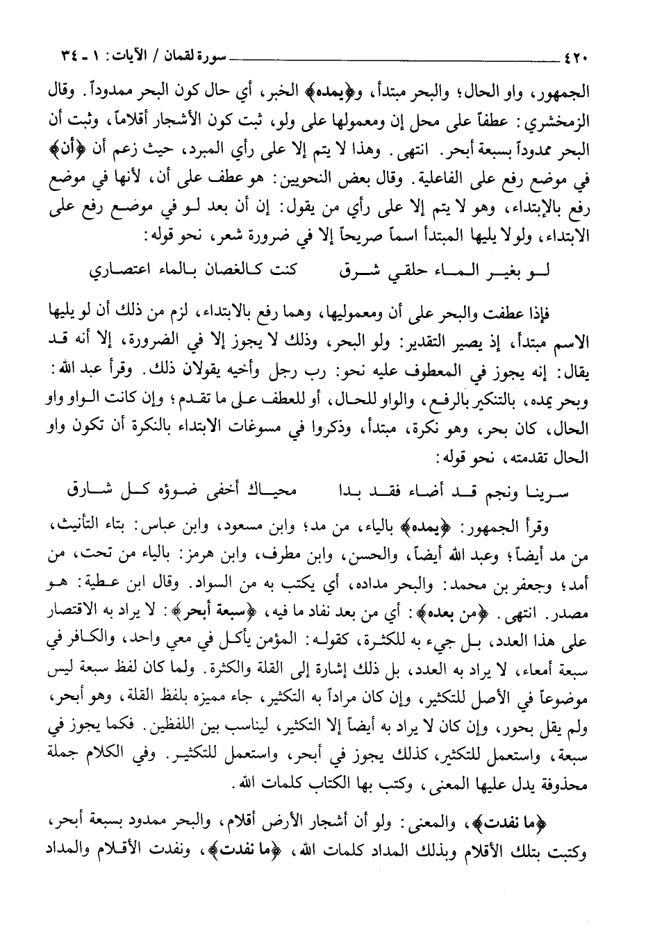 ، أَيْ يُكْتَبُ بِهِ مِنَ السَّوَادِ. وَقَالَ ابْنُ عَطِيَّةَ: هُوَ مَصْدَرٌ. انْتَهَى. مِنْ بَعْدِهِ: أَيْ مِنْ بَعْدِ نَفَادِ مَا فِيهِ، سَبْعَةُ أَبْحُرٍ: لَا يُرَادُ بِهِ الِاقْتِصَارُ عَلَى هَذَا الْعَدَدِ، بَلْ جِيءَ به لِلْكَثْرَةِ، كَقَوْلِهِ: الْمُؤْمِنُ يَأْكُلُ فِي مِعًى وَاحِدٍ، وَالْكَافِرُ فِي سَبْعَةِ أَمْعَاءَ، لَا يُرَادُ بِهِ الْعَدَدُ، بَلْ ذَلِكَ إِشَارَةٌ إِلَى الْقِلَّةِ وَالْكَثْرَةِ. وَلَمَّا كَانَ لَفْظُ سَبْعَةُ لَيْسَ مَوْضُوعًا فِي الْأَصْلِ لِلتَّكْثِيرِ، وَإِنْ كَانَ مُرَادًا بِهِ التَّكْثِيرُ، جَاءَ مُمَيِّزُهُ بِلَفْظِ الْقِلَّةِ، وَهُوَ أَبْحُرٍ، وَلَمْ يَقُلْ بُحُورٍ، وَإِنْ كَانَ لَا يُرَادُ بِهِ أَيْضًا إِلَّا التَّكْثِيرُ، لِيُنَاسِبَ بَيْنَ اللَّفْظَيْنِ. فَكَمَا يَجُوزُ فِي سَبْعَةُ، وَاسْتُعْمِلَ لِلتَّكْثِيرِ، كَذَلِكَ يَجُوزُ فِي أَبْحُرٍ، وَاسْتُعْمِلَ لِلتَّكْثِيرِ. وَفِي الْكَلَامِ جُمْلَةٌ مَحْذُوفَةٌ يَدُلُّ عَلَيْهَا الْمَعْنَى، وَكَتَبَ بِهَا الْكُتَّابُ كَلِمَاتِ اللَّهِ.