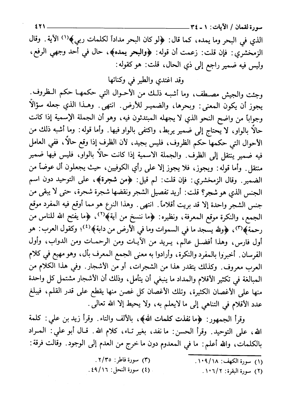وَقَرَأَ الْجُمْهُورُ: مَا نَفِدَتْ كَلِماتُ اللَّهِ، بِالْأَلِفِ وَالتَّاءِ. وَقَرَأَ زَيْدُ بْنُ عَلِيٍّ: كَلِمَةُ اللَّهِ، عَلَى التَّوْحِيدِ. وَقَرَأَ الْحَسَنُ: مَا نَفِدَ، بِغَيْرِ تَاءٍ، كَلَامُ اللَّهِ. قَالَ أَبُو عَلِيٍّ: الْمُرَادُ بِالْكَلِمَاتِ، وَاللَّهُ أَعْلَمُ: مَا فِي الْمَعْدُومِ دُونَ مَا خَرَجَ مِنَ الْعَدَمِ إِلَى الْوُجُودِ. وَقَالَتْ فرقة:
