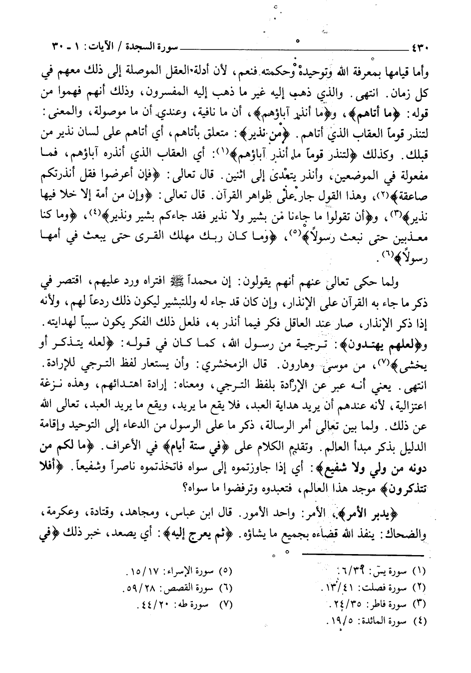 لِتُنْذِرَ قَوْمًا الْعِقَابَ الَّذِي أَتَاهُمْ. مِنْ نَذِيرٍ: متعلق بأتاهم، أَيْ أَتَاهُمْ عَلَى لِسَانِ نَذِيرٍ مِنْ قَبْلِكَ. وَكَذَلِكَ لِتُنْذِرَ قَوْماً مَا أُنْذِرَ آباؤُهُمْ «1» : أَيِ الْعِقَابَ الَّذِي أنذره آباؤهم، فما مفعولة في الموضعين، وأنذر يَتَعَدَّى إِلَى اثْنَيْنِ. قَالَ تَعَالَى: فَإِنْ أَعْرَضُوا فَقُلْ أَنْذَرْتُكُمْ صاعِقَةً «2» ، وَهَذَا الْقَوْلُ جَارٍ عَلَى ظَوَاهِرِ الْقُرْآنِ. قَالَ تَعَالَى: وَإِنْ مِنْ أُمَّةٍ إِلَّا خَلا فِيها نَذِيرٌ «3» ، وأَنْ تَقُولُوا مَا جاءَنا مِنْ بَشِيرٍ وَلا نَذِيرٍ فَقَدْ جاءَكُمْ بَشِيرٌ وَنَذِيرٌ «4» ، وَما كُنَّا مُعَذِّبِينَ حَتَّى نَبْعَثَ رَسُولًا «5» ، وَما كانَ رَبُّكَ مُهْلِكَ الْقُرى حَتَّى يَبْعَثَ فِي أُمِّها رَسُولًا «6» .