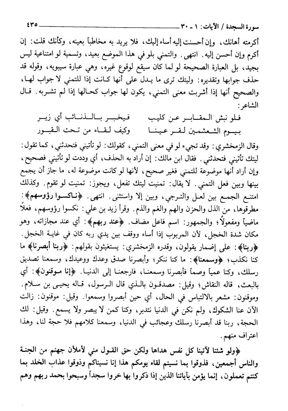 لَيْتَكَ تَأْتِينِي فَتُحَدِّثُنِي. فَقَالَ ابْنُ مَالِكٍ: إِنْ أَرَادَ بِهِ الْحَذْفَ، أَيْ وَدِدْتُ لَوْ تَأْتِينِي فَصَحِيحٌ، وَإِنْ أَرَادَ أَنَّهَا مَوْضُوعَةٌ لِلتَّمَنِّي فَغَيْرُ صَحِيحٍ، لِأَنَّهَا لَوْ كَانَتْ مَوْضُوعَةً لَهُ، مَا جَازَ أَنْ يُجْمَعَ بَيْنَهَا وَبَيْنَ فِعْلِ التَّمَنِّي. لَا يُقَالُ: تَمَنَّيْتُ لَيْتَكَ تَفْعَلُ، وَيَجُوزُ: تَمَنَّيْتُ لَوْ تَقُومُ. وَكَذَلِكَ امْتَنَعَ الْجَمْعُ بَيْنَ لَعَلَّ وَالتَّرَجِّي، وَبَيْنَ إلا واستثنى. انتهى. ناكِسُوا رُؤُسِهِمْ: