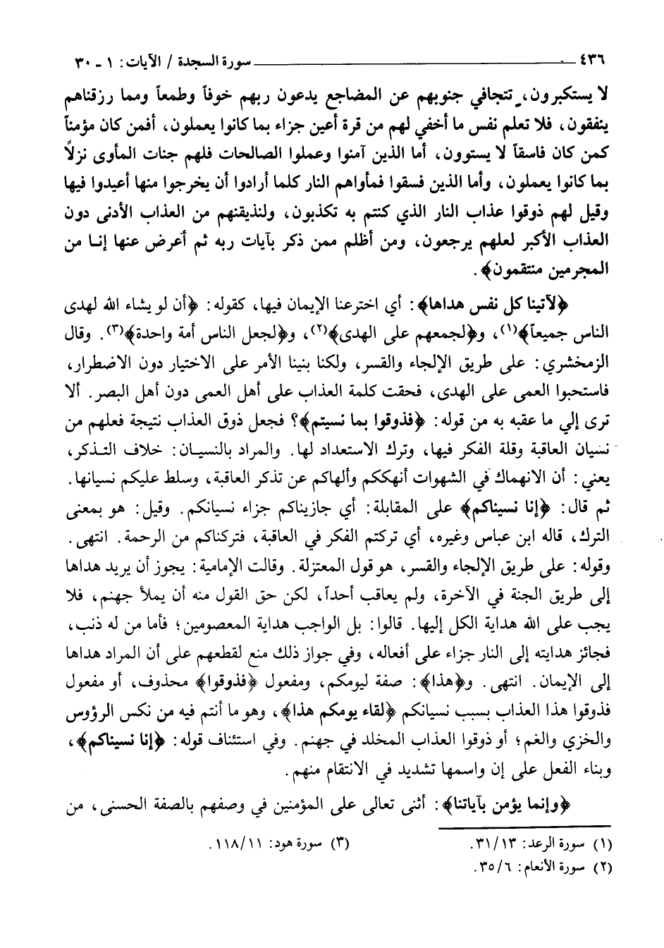 لَا يَسْتَكْبِرُونَ، تَتَجافى جُنُوبُهُمْ عَنِ الْمَضاجِعِ يَدْعُونَ رَبَّهُمْ خَوْفاً وَطَمَعاً وَمِمَّا رَزَقْناهُمْ يُنْفِقُونَ، فَلا تَعْلَمُ نَفْسٌ مَا أُخْفِيَ لَهُمْ مِنْ قُرَّةِ أَعْيُنٍ جَزاءً بِما كانُوا يَعْمَلُونَ، أَفَمَنْ كانَ مُؤْمِناً كَمَنْ كانَ فاسِقاً لَا يَسْتَوُونَ، أَمَّا الَّذِينَ آمَنُوا وَعَمِلُوا الصَّالِحاتِ فَلَهُمْ جَنَّاتُ الْمَأْوى نُزُلًا بِما كانُوا يَعْمَلُونَ، وَأَمَّا الَّذِينَ فَسَقُوا فَمَأْواهُمُ النَّارُ كُلَّما أَرادُوا أَنْ يَخْرُجُوا مِنْها أُعِيدُوا فِيها وَقِيلَ لَهُمْ ذُوقُوا عَذابَ النَّارِ الَّذِي كُنْتُمْ بِهِ تُكَذِّبُونَ، وَلَنُذِيقَنَّهُمْ مِنَ الْعَذابِ الْأَدْنى دُونَ الْعَذابِ الْأَكْبَرِ لَعَلَّهُمْ يَرْجِعُونَ، وَمَنْ أَظْلَمُ مِمَّنْ ذُكِّرَ بِآياتِ رَبِّهِ ثُمَّ أَعْرَضَ عَنْها إِنَّا مِنَ الْمُجْرِمِينَ مُنْتَقِمُونَ.