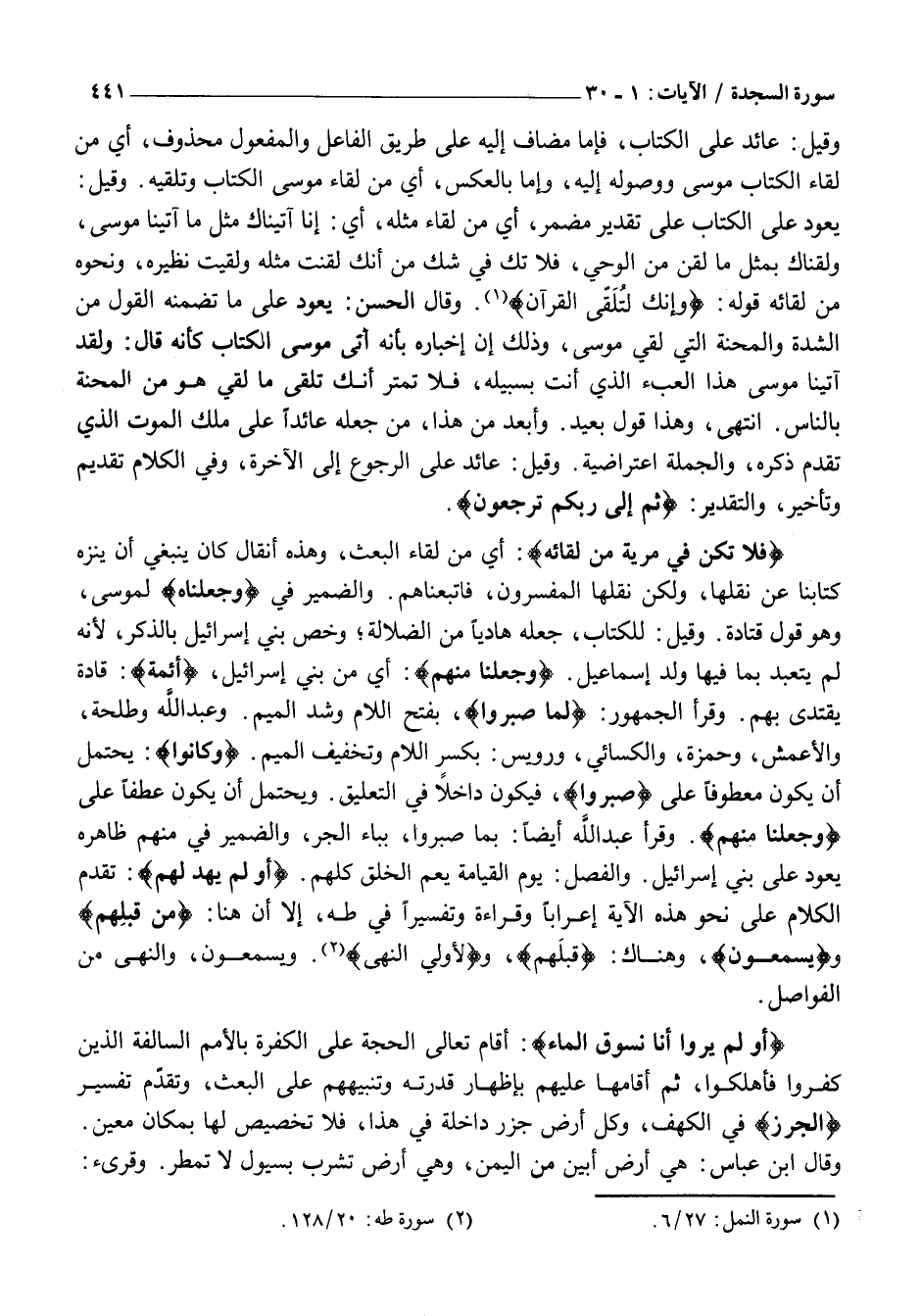 فَلا تَكُنْ فِي مِرْيَةٍ مِنْ لِقائِهِ: أَيْ مِنْ لِقَاءِ الْبَعْثِ، وَهَذِهِ أَنْقَالٌ كَانَ يَنْبَغِي أَنْ يُنَزَّهَ كِتَابُنَا عَنْ نَقْلِهَا، وَلَكِنْ نَقَلَهَا الْمُفَسِّرُونَ، فَاتَّبَعْنَاهُمْ. وَالضَّمِيرُ فِي وَجَعَلْناهُ لِمُوسَى، وَهُوَ قَوْلُ قَتَادَةَ. وَقِيلَ: لِلْكِتَابِ، جَعَلَهُ هَادِيًا مِنَ الضَّلَالَةِ وَخَصَّ بَنِي إِسْرَائِيلَ بِالذِّكْرِ، لِأَنَّهُ لَمْ يَتَعَبَّدْ بِمَا فِيهَا وَلَدَ إِسْمَاعِيلَ. وَجَعَلْنا مِنْهُمْ: أَيْ مِنْ بَنِي إِسْرَائِيلَ، أَئِمَّةً: قَادَةً يُقْتَدَى بِهِمْ. وَقَرَأَ الْجُمْهُورُ: لَمَّا صَبَرُوا، بِفَتْحِ اللَّامِ وَشَدِّ الْمِيمِ. وَعَبْدُ اللَّهِ وَطَلْحَةُ، وَالْأَعْمَشُ، وَحَمْزَةُ، وَالْكِسَائِيُّ، وَرُوَيْسٌ: بِكَسْرِ اللَّامِ وَتَخْفِيفِ الْمِيمِ. وَكانُوا: يُحْتَمَلُ أَنْ يَكُونَ مَعْطُوفًا عَلَى صَبَرُوا، فَيَكُونَ دَاخِلًا فِي التَّعْلِيقِ. وَيَحْتَمِلُ أَنْ يَكُونَ عَطْفًا عَلَى وَجَعَلْنا مِنْهُمْ. وَقَرَأَ عَبْدُ اللَّهِ أَيْضًا: بِمَا صَبَرُوا، بِبَاءِ الْجَرِّ، وَالضَّمِيرُ فِي مِنْهُمْ ظَاهِرُهُ يُعُودُ عَلَى بَنِي إِسْرَائِيلَ. وَالْفَصْلُ: يَوْمَ الْقِيَامَةِ يَعُمُّ الْخَلْقَ كُلَّهُمْ. أَوَلَمْ يَهْدِ لَهُمْ: تَقَدَّمَ الْكَلَامُ عَلَى نَحْوِ هَذِهِ الْآيَةِ إِعْرَابًا وَقِرَاءَةً وَتَفْسِيرًا فِي طه، إِلَّا أَنَّ هُنَا: مِنْ قَبْلِهِمْ ويَسْمَعُونَ، وهناك: قَبْلِهِمْ، ولِأُولِي النُّهى «2» . وَيَسْمَعُونَ، وَالنُّهَى مِنَ الْفَوَاصِلِ.