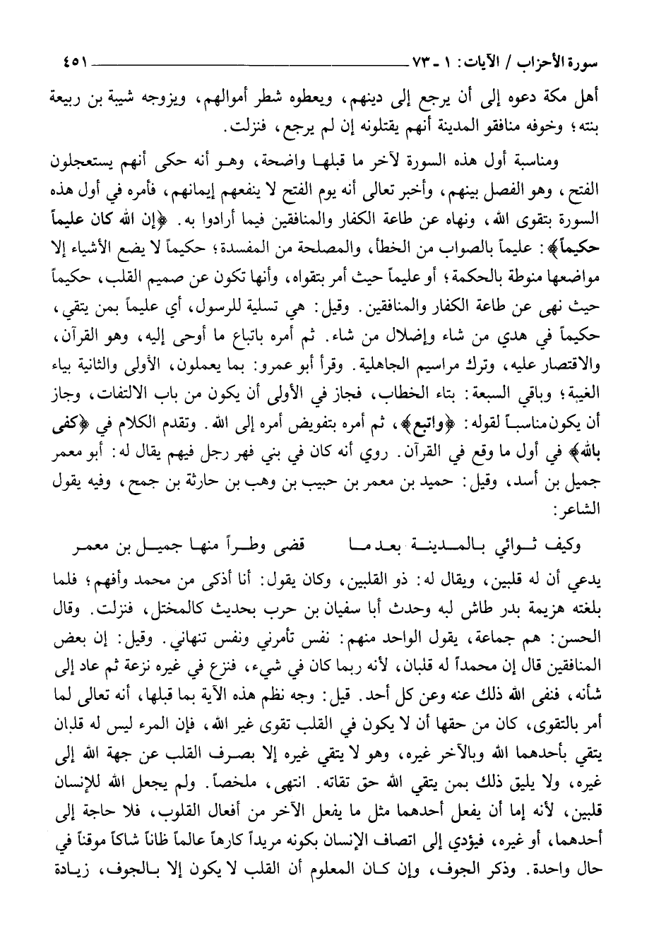 وَمُنَاسَبَةُ أَوَّلِ هَذِهِ السُّورَةِ لِآخِرِ مَا قَبْلَهَا وَاضِحَةٌ، وَهُوَ أَنَّهُ حَكَى أَنَّهُمْ يَسْتَعْجِلُونَ الْفَتْحَ، وَهُوَ الْفَصْلُ بَيْنَهُمْ، وَأَخْبَرَ تَعَالَى أَنَّهُ يَوْمَ الْفَتْحِ لَا يَنْفَعُهُمْ إِيمَانُهُمْ، فَأَمَرَهُ فِي أَوَّلِ هَذِهِ السُّورَةِ بِتَقْوَى اللَّهِ، وَنَهَاهُ عَنْ طَاعَةِ الْكُفَّارِ وَالْمُنَافِقِينَ فِيمَا أَرَادُوا بِهِ. إِنَّ اللَّهَ كانَ عَلِيماً حَكِيماً: عَلِيمًا بِالصَّوَابِ مِنَ الْخَطَأِ، وَالْمَصْلَحَةِ مِنَ الْمَفْسَدَةِ حَكِيمًا لَا يَضَعُ الْأَشْيَاءَ إِلَّا مَوَاضِعَهَا مَنُوطَةً بِالْحِكْمَةِ أَوْ عَلِيمًا حَيْثُ أَمَرَ بِتَقْوَاهُ، وَأَنَّهَا تَكُونُ عَنْ صَمِيمِ الْقَلْبِ، حَكِيمًا حَيْثُ نَهَى عَنْ طَاعَةِ الْكُفَّارِ وَالْمُنَافِقِينَ. وَقِيلَ: هِيَ تَسْلِيَةٌ لِلرَّسُولِ، أَيْ عَلِيمًا بِمَنْ يَتَّقِي، حَكِيمًا فِي هَدْيِ مَنْ شَاءَ وَإِضْلَالِ مَنْ شَاءَ. ثُمَّ أَمَرَهُ بِاتِّبَاعِ مَا أُوحِيَ إِلَيْهِ، وَهُوَ الْقُرْآنُ، وَالِاقْتِصَارِ عَلَيْهِ، وَتَرْكِ مَرَاسِيمِ الْجَاهِلِيَّةِ. وَقَرَأَ أَبُو عَمْرٍو: بِمَا يَعْمَلُونَ، الْأُولَى وَالثَّانِيَةَ بِيَاءِ الْغَيْبَةِ وَبَاقِي السَّبْعَةِ: بِتَاءِ الْخِطَابِ، فَجَازَ فِي الْأُولَى أَنْ يَكُونَ مِنْ بَابِ الِالْتِفَاتِ، وَجَازَ أَنْ يَكُونَ مُنَاسِبًا لِقَوْلِهِ: وَاتَّبِعْ، ثُمَّ أَمَرَهُ بِتَفْوِيضِ أَمْرِهِ إِلَى اللَّهِ. وَتَقَدَّمَ الْكَلَامُ فِي كَفى بِاللَّهِ فِي أَوَّلِ مَا وَقَعَ فِي الْقُرْآنِ.