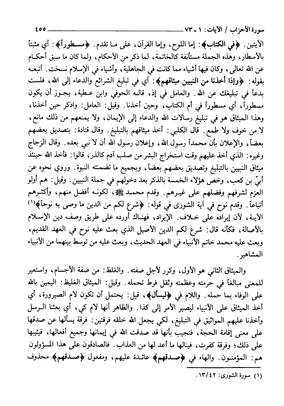 وَالْمِيثَاقُ الثَّانِي هُوَ الْأَوَّلُ، وَكُرِّرَ لِأَجْلِ صِفَتِهِ. وَالْغِلَظُ: مِنْ صِفَةِ الْأَجْسَامِ، وَاسْتُعِيرَ لِلْمَعْنَى مُبَالَغًا فِي حُرْمَتِهِ وَعَظَمَتِهِ وَثِقَلِ فَرْطِ تَحَمُّلِهِ. وَقِيلَ: الْمِيثَاقُ الْغَلِيظُ: الْيَمِينُ بِاللَّهِ عَلَى الْوَفَاءِ بِمَا حَمَلَهُ. وَاللَّامُ فِي لِيَسْئَلَ، قِيلَ: يُحْتَمَلُ أَنْ تَكُونَ لَامَ الصَّيْرُورَةِ، أَيْ أَخَذَ الْمِيثَاقَ عَلَى الْأَنْبِيَاءِ لِيَصِيرَ الْأَمْرُ إِلَى كَذَا. وَالظَّاهِرُ أَنَّهَا لَامُ كَيْ، أَيْ بَعَثْنَا الرُّسُلَ وَأَخَذْنَا عَلَيْهِمُ الْمَوَاثِيقَ فِي التَّبْلِيغِ، لِكَيْ يَجْعَلَ اللَّهُ خَلْقَهُ فِرْقَتَيْنِ: فِرْقَةً يَسْأَلُهَا عَنْ صِدْقِهَا عَلَى مَعْنَى إِقَامَةِ الْحُجَّةِ، فَتُجِيبُ بِأَنَّهَا قَدْ صَدَقَتِ اللَّهَ فِي إِيمَانِهَا وَجَمِيعِ أَفْعَالِهَا، فَيُثِيبُهَا عَلَى ذَلِكَ وَفِرْقَةً كَفَرَتْ، فَيَنَالُهَا مَا أَعَدَّ لَهَا مِنَ الْعَذَابِ. فَالصَّادِقُونَ عَلَى هَذَا الْمَسْئُولُونَ هُمُ: الْمُؤْمِنُونَ. وَالْهَاءُ فِي صِدْقِهِمْ عَائِدَةٌ عَلَيْهِمْ، وَمَفْعُولُ صِدْقِهِمْ محذوف