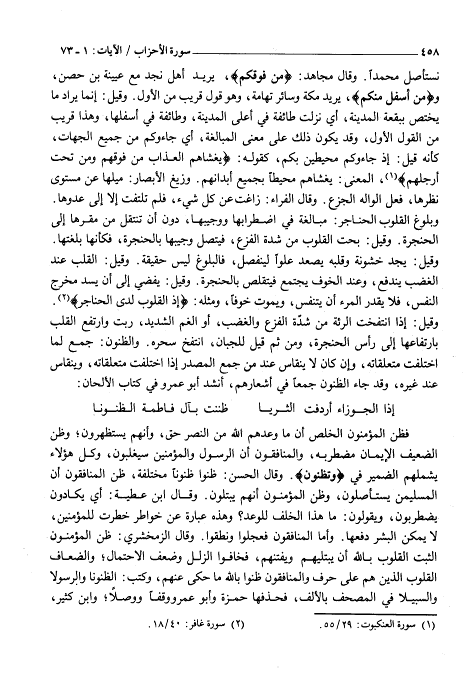 نَسْتَأْصِلَ مُحَمَّدًا. وَقَالَ مُجَاهِدٌ: مِنْ فَوْقِكُمْ، يُرِيدُ أَهْلَ نَجْدٍ مَعَ عُيَيْنَةَ بْنِ حصن، ومِنْ أَسْفَلَ مِنْكُمْ، يُرِيدُ مَكَّةَ وَسَائِرَ تِهَامَةَ، وَهُوَ قَوْلٌ قَرِيبٌ مِنَ الْأَوَّلِ. وَقِيلَ: إِنَّمَا يُرَادُ مَا يَخْتَصُّ بِبُقْعَةِ الْمَدِينَةِ، أَيْ نَزَلَتْ طَائِفَةٌ فِي أَعْلَى الْمَدِينَةِ، وَطَائِفَةٌ فِي أَسْفَلِهَا، وَهَذَا قَرِيبٌ مِنَ الْقَوْلِ الْأَوَّلِ، وَقَدْ يَكُونُ ذَلِكَ عَلَى مَعْنَى الْمُبَالَغَةِ، أَيْ جَاءُوكُمْ مِنْ جَمِيعِ الْجِهَاتِ، كَأَنَّهُ قِيلَ: إِذْ جَاءُوكُمْ مُحِيطِينَ بِكُمْ، كَقَوْلِهِ: يَغْشاهُمُ الْعَذابُ مِنْ فَوْقِهِمْ وَمِنْ تَحْتِ أَرْجُلِهِمْ «1» ، الْمَعْنَى: يَغْشَاهُمْ مُحِيطًا بِجَمِيعِ أَبْدَانِهِمْ. وَزَيْغُ الْأَبْصَارِ: مَيْلُهَا عَنْ مُسْتَوَى نَظَرِهَا، فِعْلُ الْوَالِهِ الْجَزِعِ. وَقَالَ الفراء: زاغت عن كُلِّ شَيْءٍ، فَلَمْ تَلْتَفِتْ إِلَّا إِلَى عَدُوِّهَا.