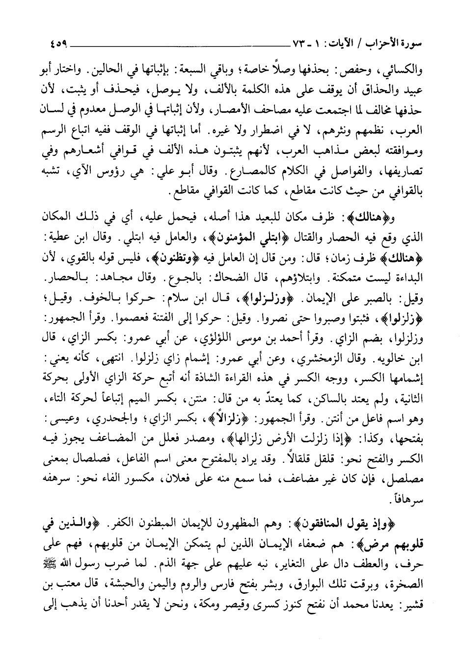 هُنالِكَ ظَرْفُ زَمَانٍ قَالَ: وَمَنْ قَالَ إِنَّ الْعَامِلَ فِيهِ وَتَظُنُّونَ، فَلَيْسَ قَوْلُهُ بِالْقَوِيِّ، لِأَنَّ الْبَدَاءَةَ لَيْسَتْ مُتَمَكِّنَةً. وَابْتِلَاؤُهُمْ، قَالَ الضَّحَّاكُ: بِالْجُوعِ. وَقَالَ مُجَاهِدٌ: بِالْحِصَارِ.