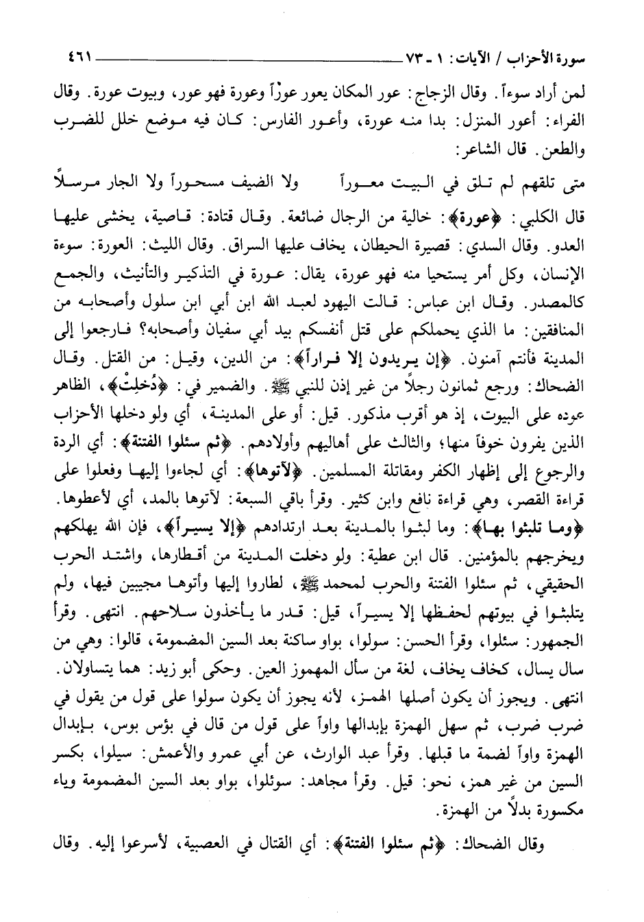 قَالَ الْكَلْبِيُّ: عَوْرَةٌ: خَالِيَةٌ مِنَ الرِّجَالِ ضَائِعَةٌ. وَقَالَ قَتَادَةُ: قَاصِيَةٌ، يُخْشَى عَلَيْهَا الْعَدُوُّ. وَقَالَ السُّدِّيُّ: قَصِيرَةُ الْحِيطَانِ، يُخَافُ عَلَيْهَا السُّرَّاقُ. وقال الليث: العورة: سوءة الْإِنْسَانِ، وَكُلُّ أَمْرٍ يُسْتَحَيَا مِنْهُ فَهُوَ عَوْرَةٌ، يُقَالُ: عَوْرَةٌ فِي التَّذْكِيرِ وَالتَّأْنِيثِ، وَالْجَمْعُ كَالْمَصْدَرِ. وَقَالَ ابْنُ عَبَّاسٍ: قَالَتِ الْيَهُودُ لِعَبْدِ الله ابن أُبَيٍّ ابْنُ سَلُولَ وَأَصْحَابُهُ مِنَ الْمُنَافِقِينَ: مَا الَّذِي يَحْمِلُكُمْ عَلَى قَتْلِ أَنْفُسِكُمْ بِيَدِ أَبِي سُفْيَانَ وَأَصْحَابِهِ؟ فَارْجِعُوا إِلَى الْمَدِينَةِ فَأَنْتُمْ آمِنُونَ. إِنْ يُرِيدُونَ إِلَّا فِراراً: مِنَ الدِّينِ، وَقِيلَ: مِنَ الْقَتْلِ. وَقَالَ الضَّحَّاكُ: وَرَجَعَ ثَمَانُونَ رَجُلًا مِنْ غَيْرِ إِذْنٍ لِلنَّبِيِّ صَلَّى اللَّهُ عَلَيْهِ وَسَلَّمَ. وَالضَّمِيرُ فِي: دُخِلَتْ، الظَّاهِرُ عَوْدُهُ عَلَى الْبُيُوتِ، إِذْ هُوَ أَقْرَبُ مَذْكُورٍ. قِيلَ: أَوْ عَلَى الْمَدِينَةِ، أَيْ وَلَوْ دَخَلَهَا الْأَحْزَابُ الَّذِينَ يَفِرُّونَ خَوْفًا مِنْهَا وَالثَّالِثُ عَلَى أَهَالِيهِمْ وَأَوْلَادِهِمْ. ثُمَّ سُئِلُوا الْفِتْنَةَ: أَيِ الرِّدَّةَ وَالرُّجُوعَ إِلَى إِظْهَارِ الْكُفْرِ وَمُقَاتَلَةِ الْمُسْلِمِينَ. لَآتَوْها: أَيْ لَجَاءُوا إِلَيْهَا وَفَعَلُوا عَلَى قِرَاءَةِ الْقَصْرِ، وَهِيَ قِرَاءَةُ نَافِعٍ وَابْنِ كَثِيرٍ. وَقَرَأَ بَاقِي السَّبْعَةِ: لَآتَوْهَا بِالْمَدِّ، أَيْ لَأَعْطَوْهَا.