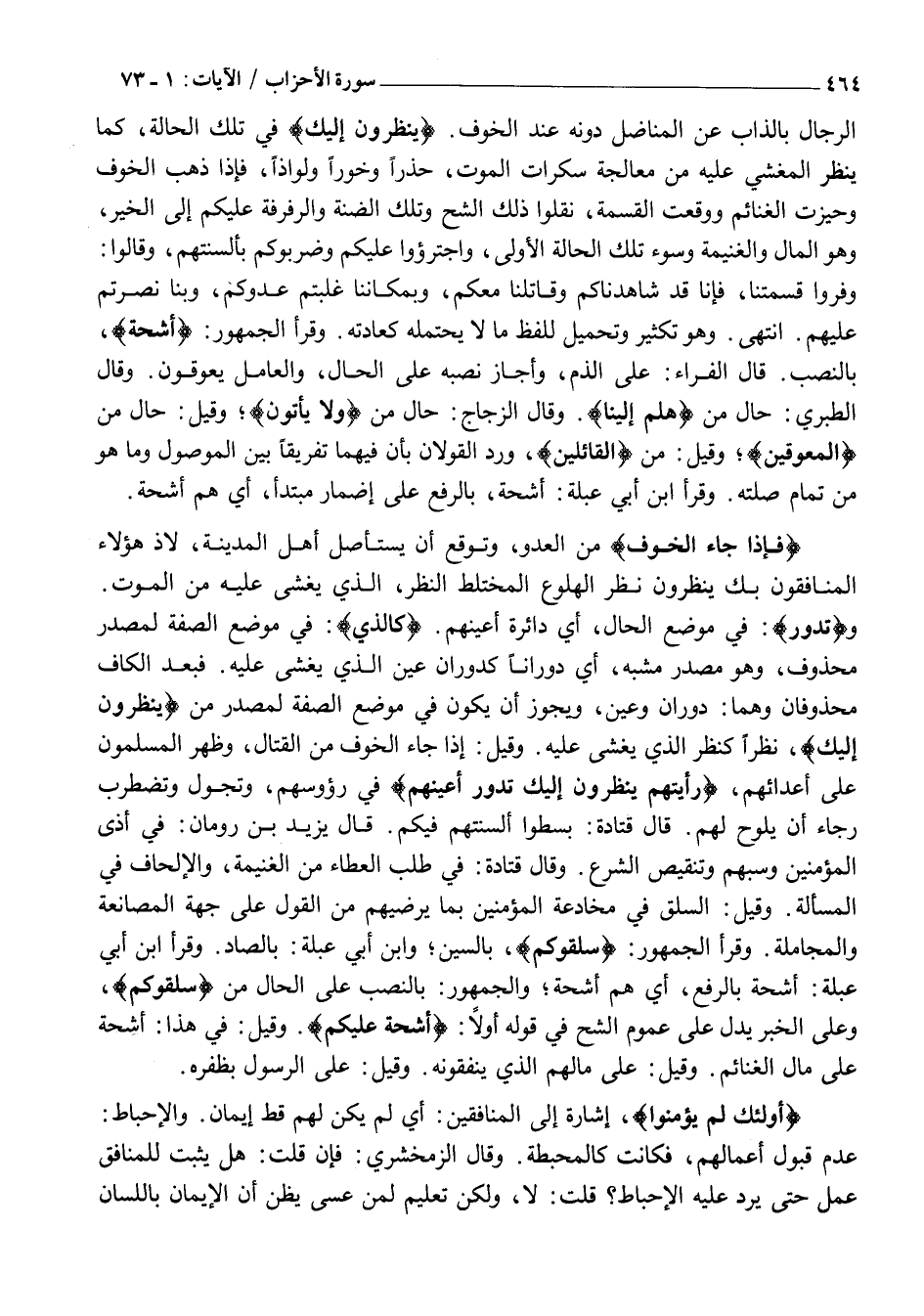 وتَدُورُ: فِي مَوْضِعِ الْحَالِ، أَيْ دَائِرَةٌ أَعْيُنُهُمْ. كَالَّذِي: فِي مَوْضِعِ الصِّفَةِ لِمَصْدَرٍ مَحْذُوفٍ، وَهُوَ مَصْدَرٌ مُشَبَّهٌ، أَيْ دَوَرَانًا كَدَوَرَانِ عَيْنِ الَّذِي يُغْشَى عَلَيْهِ. فَبَعْدَ الْكَافِ مَحْذُوفَانِ وَهُمَا: دَوْرَانٌ وَعَيْنٌ، وَيَجُوزُ أَنْ يَكُونَ فِي مَوْضِعِ الصِّفَةِ لِمَصْدَرٍ مِنْ يَنْظُرُونَ إِلَيْكَ، نَظَرًا كَنَظَرِ الَّذِي يُغْشَى عَلَيْهِ. وَقِيلَ: إِذَا جَاءَ الْخَوْفُ مِنَ الْقِتَالِ، وَظَهَرَ الْمُسْلِمُونَ عَلَى أَعْدَائِهِمْ، رَأَيْتَهُمْ يَنْظُرُونَ إِلَيْكَ تَدُورُ أَعْيُنُهُمْ في رؤوسهم، وَتَجُولُ وَتَضْطَرِبُ رَجَاءَ أَنْ يَلُوحَ لَهُمْ. قَالَ قَتَادَةُ: بَسَطُوا أَلْسِنَتَهُمْ فِيكُمْ. قَالَ يَزِيدُ بْنُ رُومَانَ: فِي أَذَى الْمُؤْمِنِينَ وَسَبِّهِمْ وَتَنْقِيصِ الشَّرْعِ. وَقَالَ قَتَادَةُ: فِي طَلَبِ الْعَطَاءِ مِنَ الْغَنِيمَةِ، وَالْإِلْحَافِ فِي الْمَسْأَلَةِ. وَقِيلَ: السَّلْقُ فِي مُخَادَعَةِ الْمُؤْمِنِينَ بِمَا يُرْضِيهِمْ مِنَ الْقَوْلِ عَلَى جِهَةِ الْمُصَانَعَةِ وَالْمُجَامَلَةِ. وَقَرَأَ الْجُمْهُورُ: سَلَقُوكُمْ، بِالسِّينِ وَابْنُ أَبِي عَبْلَةَ: بِالصَّادِ. وَقَرَأَ ابْنُ أَبِي عَبْلَةَ: أَشِحَّةً بِالرَّفْعِ، أَيْ هُمْ أَشِحَّةٌ وَالْجُمْهُورُ: بِالنَّصْبِ عَلَى الْحَالِ مِنْ سَلَقُوكُمْ، وَعَلَى الْخَبَرِ يَدُلُّ عَلَى عُمُومِ الشُّحِّ فِي قَوْلِهِ أَوَّلًا: أَشِحَّةً عَلَيْكُمْ. وَقِيلَ: فِي هَذَا: أَشِحَّةً عَلَى مَالِ الْغَنَائِمِ. وَقِيلَ: عَلَى مَالِهِمُ الَّذِي يُنْفِقُونَهُ. وَقِيلَ: عَلَى الرسول بِظَفَرِهِ.