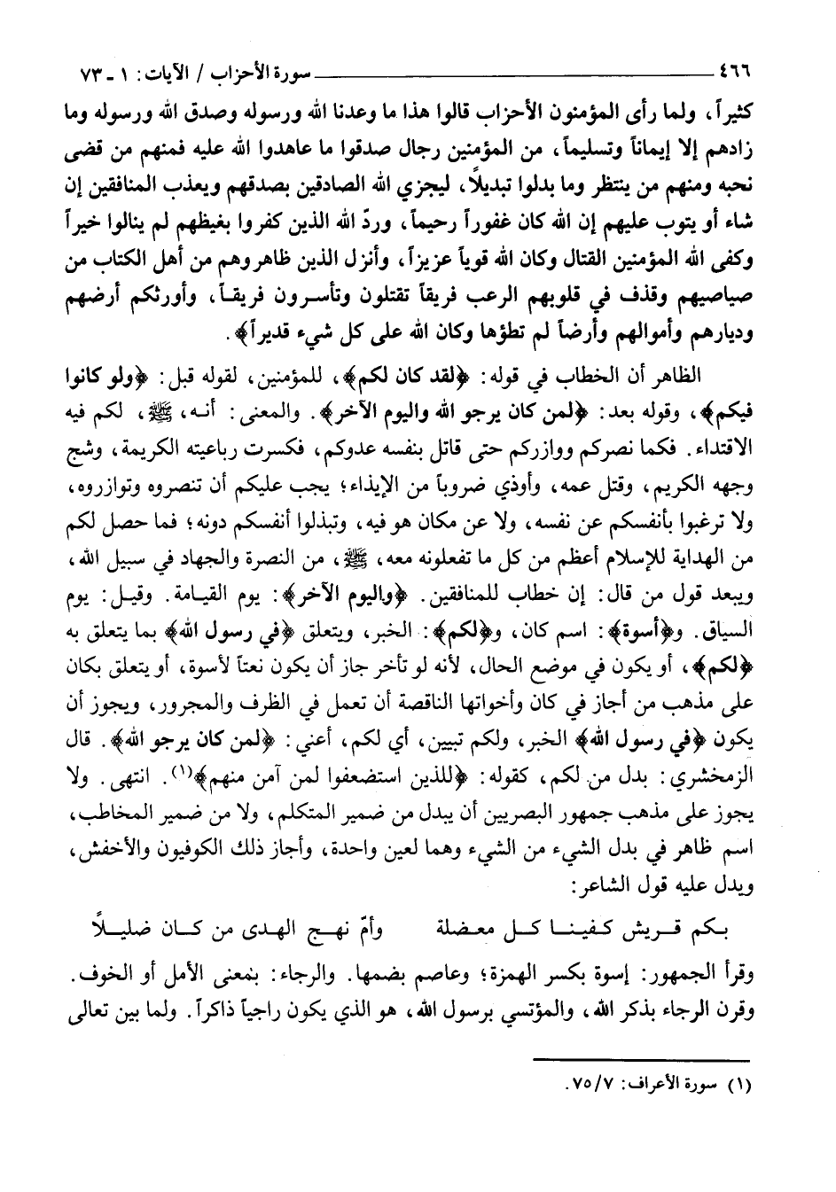 كَثِيراً، وَلَمَّا رَأَ الْمُؤْمِنُونَ الْأَحْزابَ قالُوا هَذَا مَا وَعَدَنَا اللَّهُ وَرَسُولُهُ وَصَدَقَ اللَّهُ وَرَسُولُهُ وَما زادَهُمْ إِلَّا إِيماناً وَتَسْلِيماً، مِنَ الْمُؤْمِنِينَ رِجالٌ صَدَقُوا مَا عاهَدُوا اللَّهَ عَلَيْهِ فَمِنْهُمْ مَنْ قَضى نَحْبَهُ وَمِنْهُمْ مَنْ يَنْتَظِرُ وَما بَدَّلُوا تَبْدِيلًا، لِيَجْزِيَ اللَّهُ الصَّادِقِينَ بِصِدْقِهِمْ وَيُعَذِّبَ الْمُنافِقِينَ إِنْ شاءَ أَوْ يَتُوبَ عَلَيْهِمْ إِنَّ اللَّهَ كانَ غَفُوراً رَحِيماً، وَرَدَّ اللَّهُ الَّذِينَ كَفَرُوا بِغَيْظِهِمْ لَمْ يَنالُوا خَيْراً وَكَفَى اللَّهُ الْمُؤْمِنِينَ الْقِتالَ وَكانَ اللَّهُ قَوِيًّا عَزِيزاً، وَأَنْزَلَ الَّذِينَ ظاهَرُوهُمْ مِنْ أَهْلِ الْكِتابِ مِنْ صَياصِيهِمْ وَقَذَفَ فِي قُلُوبِهِمُ الرُّعْبَ فَرِيقاً تَقْتُلُونَ وَتَأْسِرُونَ فَرِيقاً، وَأَوْرَثَكُمْ أَرْضَهُمْ وَدِيارَهُمْ وَأَمْوالَهُمْ وَأَرْضاً لَمْ تَطَؤُها وَكانَ اللَّهُ عَلى كُلِّ شَيْءٍ قَدِيراً.