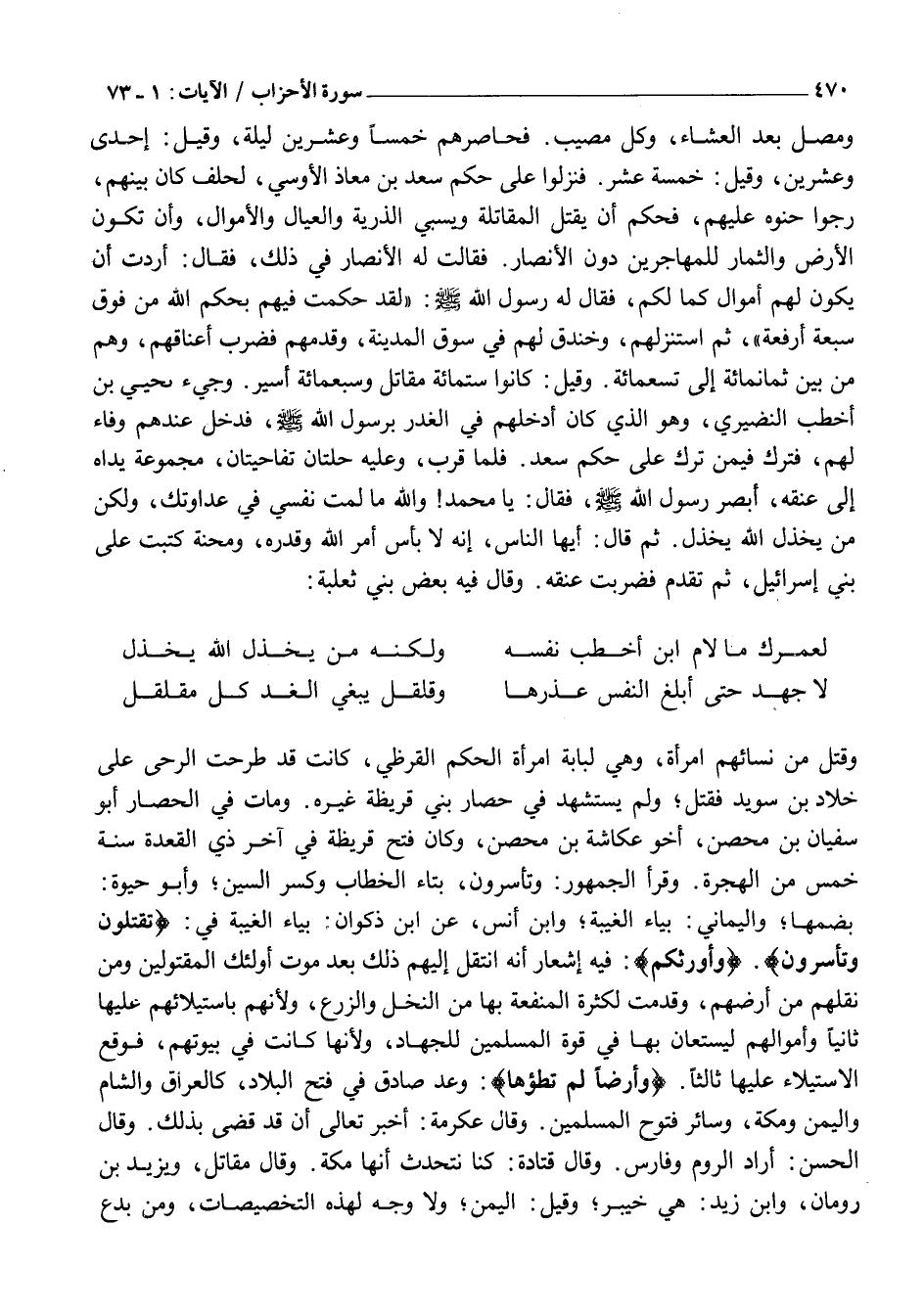 وَقَتَلَ مِنْ نِسَائِهِمُ امْرَأَةً، وَهِيَ لُبَابَةُ امْرَأَةُ الْحَكَمِ الْقُرَظِيِّ، كَانَتْ قَدْ طَرَحَتِ الرَّحَى عَلَى خَلَّادِ بْنِ سُوَيْدٍ فَقُتِلَ وَلَمْ يُسْتَشْهَدْ فِي حِصَارِ بَنِي قُرَيْظَةَ غَيْرُهُ. وَمَاتَ فِي الْحِصَارِ أَبُو سُفْيَانَ بْنُ مِحْصَنٍ، أَخُو عُكَّاشَةَ بْنِ مِحْصَنٍ، وَكَانَ فَتْحُ قُرَيْظَةَ فِي آخِرِ ذِي الْقِعْدَةِ سَنَةَ خَمْسٍ مِنَ الْهِجْرَةِ. وَقَرَأَ الْجُمْهُورُ: وَتَأْسِرُونَ، بِتَاءِ الْخِطَابِ وَكَسْرِ السِّينِ وأبو حيوة: