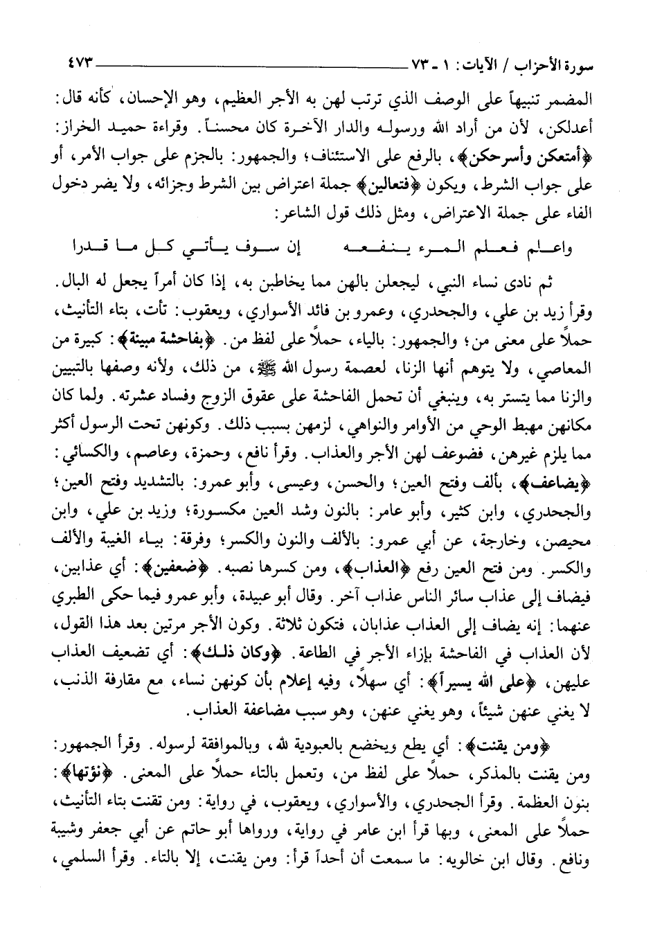 وَقَرَأَ زَيْدُ بْنُ عَلِيٍّ، وَالْجَحْدَرِيُّ، وَعَمْرُو بْنُ فَائِدٍ الْأَسْوَارِيُّ، وَيَعْقُوبُ: تَأْتِ، بِتَاءِ التَّأْنِيثُ، حَمْلًا عَلَى مَعْنَى مَنْ وَالْجُمْهُورُ: بِالْيَاءِ، حَمْلًا عَلَى لَفْظِ مِنْ. بِفاحِشَةٍ مُبَيِّنَةٍ: كَبِيرَةٍ مِنَ الْمَعَاصِي، وَلَا يتوهم أنها الزنا، لِعِصْمَةِ رَسُولِ اللَّهِ صَلَّى الله عَلَيْهِ وَسَلَّمَ، مِنْ ذَلِكَ، وَلِأَنَّهُ وَصَفَهَا بِالتَّبْيِينِ والزنا مِمَّا يُتَسَتَّرُ بِهِ، وَيَنْبَغِي أَنْ تُحْمَلَ الْفَاحِشَةُ عَلَى عُقُوقِ الزَّوْجِ وَفَسَادِ عِشْرَتِهِ. وَلَمَّا كَانَ مَكَانُهُنَّ مَهْبِطَ الْوَحْيِ مِنَ الْأَوَامِرِ وَالنَّوَاهِي، لَزِمَهُنَّ بِسَبَبِ ذَلِكَ. وَكَوْنِهِنَّ تحت الرسول أَكْثَرُ مِمَّا يَلْزَمُ غَيْرَهُنَّ، فَضُوعِفَ لَهُنَّ الْأَجْرُ وَالْعَذَابُ. وَقَرَأَ نَافِعٌ، وَحَمْزَةُ، وَعَاصِمٌ، وَالْكِسَائِيُّ: