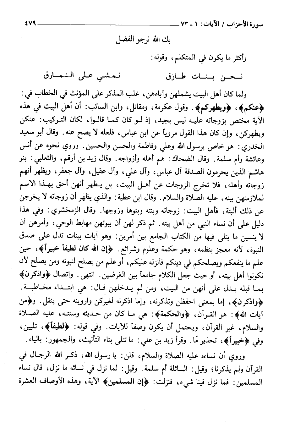 وَقَالَ ابْنُ عَطِيَّةَ: وَالَّذِي يَظْهَرُ أَنَّ زَوْجَاتِهِ لَا يَخْرُجْنَ عَنْ ذَلِكَ الْبَتَّةَ، فَأَهْلُ الْبَيْتِ: زَوْجَاتُهُ وَبِنْتُهُ وَبَنُوهَا وَزَوْجُهَا. وَقَالَ الزَّمَخْشَرِيُّ: وَفِي هَذَا دَلِيلٌ عَلَى أَنَّ نِسَاءَ النبي مِنْ أَهْلِ بَيْتِهِ. ثُمَّ ذَكَرَ لَهُنَّ أَنَّ بُيُوتَهُنَّ مَهَابِطُ الْوَحْيِ، وَأَمَرَهُنَّ أَنْ لَا يَنْسَيْنَ مَا يُتْلَى فِيهَا مِنَ الْكِتَابِ الْجَامِعِ بَيْنَ أَمْرَيْنِ: وَهُوَ آيَاتٌ بَيِّنَاتٌ تَدُلُّ عَلَى صِدْقِ النُّبُوَّةِ، لِأَنَّهُ مُعْجِزٌ بِنَظْمِهِ، وَهُوَ حِكْمَةٌ وَعُلُومٌ وَشَرَائِعُ. إِنَّ اللَّهَ كانَ لَطِيفاً خَبِيراً، حِينَ عَلِمَ مَا يَنْفَعُكُمْ وَيُصْلِحُكُمْ فِي دِينِكُمْ فَأَنْزَلَهُ عَلَيْكُمْ، أَوْ عَلِمَ مَنْ يَصْلُحُ لِنُبُوَّتِهِ وَمَنْ يَصْلُحُ لِأَنْ تَكُونُوا أَهْلَ بَيْتِهِ، أَوْ حَيْثُ جُعِلَ الْكَلَامُ جَامِعًا بَيْنَ الْغَرَضَيْنِ. انْتَهَى. وَاتِّصَالُ وَاذْكُرْنَ بِمَا قَبْلَهُ يَدُلُّ عَلَى أَنَّهُنَّ مِنَ الْبَيْتِ، وَمَنْ لَمْ يُدْخِلْهُنَّ قَالَ: هِيَ ابْتِدَاءُ مُخَاطَبَةٍ.