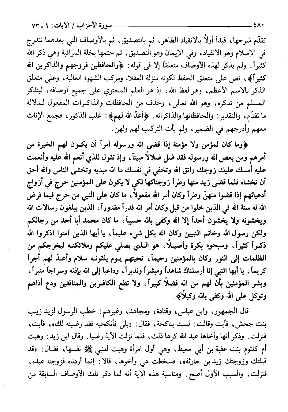 وَما كانَ لِمُؤْمِنٍ وَلا مُؤْمِنَةٍ إِذا قَضَى اللَّهُ وَرَسُولُهُ أَمْراً أَنْ يَكُونَ لَهُمُ الْخِيَرَةُ مِنْ أَمْرِهِمْ وَمَنْ يَعْصِ اللَّهَ وَرَسُولَهُ فَقَدْ ضَلَّ ضَلالًا مُبِيناً، وَإِذْ تَقُولُ لِلَّذِي أَنْعَمَ اللَّهُ عَلَيْهِ وَأَنْعَمْتَ عَلَيْهِ أَمْسِكْ عَلَيْكَ زَوْجَكَ وَاتَّقِ اللَّهَ وَتُخْفِي فِي نَفْسِكَ مَا اللَّهُ مُبْدِيهِ وَتَخْشَى النَّاسَ وَاللَّهُ أَحَقُّ أَنْ تَخْشاهُ فَلَمَّا قَضى زَيْدٌ مِنْها وَطَراً زَوَّجْناكَها لِكَيْ لَا يَكُونَ عَلَى الْمُؤْمِنِينَ حَرَجٌ فِي أَزْواجِ أَدْعِيائِهِمْ إِذا قَضَوْا مِنْهُنَّ وَطَراً وَكانَ أَمْرُ اللَّهِ مَفْعُولًا، مَا كانَ عَلَى النَّبِيِّ مِنْ حَرَجٍ فِيما فَرَضَ اللَّهُ لَهُ سُنَّةَ اللَّهِ فِي الَّذِينَ خَلَوْا مِنْ قَبْلُ وَكانَ أَمْرُ اللَّهِ قَدَراً مَقْدُوراً، الَّذِينَ يُبَلِّغُونَ رِسالاتِ اللَّهِ وَيَخْشَوْنَهُ وَلا يَخْشَوْنَ أَحَداً إِلَّا اللَّهَ وَكَفى بِاللَّهِ حَسِيباً، مَا كانَ مُحَمَّدٌ أَبا أَحَدٍ مِنْ رِجالِكُمْ وَلكِنْ رَسُولَ اللَّهِ وَخاتَمَ النَّبِيِّينَ وَكانَ اللَّهُ بِكُلِّ شَيْءٍ عَلِيماً، يَا أَيُّهَا الَّذِينَ آمَنُوا اذْكُرُوا اللَّهَ ذِكْراً كَثِيراً، وَسَبِّحُوهُ بُكْرَةً وَأَصِيلًا، هُوَ الَّذِي يُصَلِّي عَلَيْكُمْ وَمَلائِكَتُهُ لِيُخْرِجَكُمْ مِنَ الظُّلُماتِ إِلَى النُّورِ وَكانَ بِالْمُؤْمِنِينَ رَحِيماً، تَحِيَّتُهُمْ يَوْمَ يَلْقَوْنَهُ سَلامٌ وَأَعَدَّ لَهُمْ أَجْراً كَرِيماً، يَا أَيُّهَا النَّبِيُّ إِنَّا أَرْسَلْناكَ شاهِداً وَمُبَشِّراً وَنَذِيراً، وَداعِياً إِلَى اللَّهِ بِإِذْنِهِ وَسِراجاً مُنِيراً، وَبَشِّرِ الْمُؤْمِنِينَ بِأَنَّ لَهُمْ مِنَ اللَّهِ فَضْلًا كَبِيراً، وَلا تُطِعِ الْكافِرِينَ وَالْمُنافِقِينَ وَدَعْ أَذاهُمْ وَتَوَكَّلْ عَلَى اللَّهِ وَكَفى بِاللَّهِ وَكِيلًا.