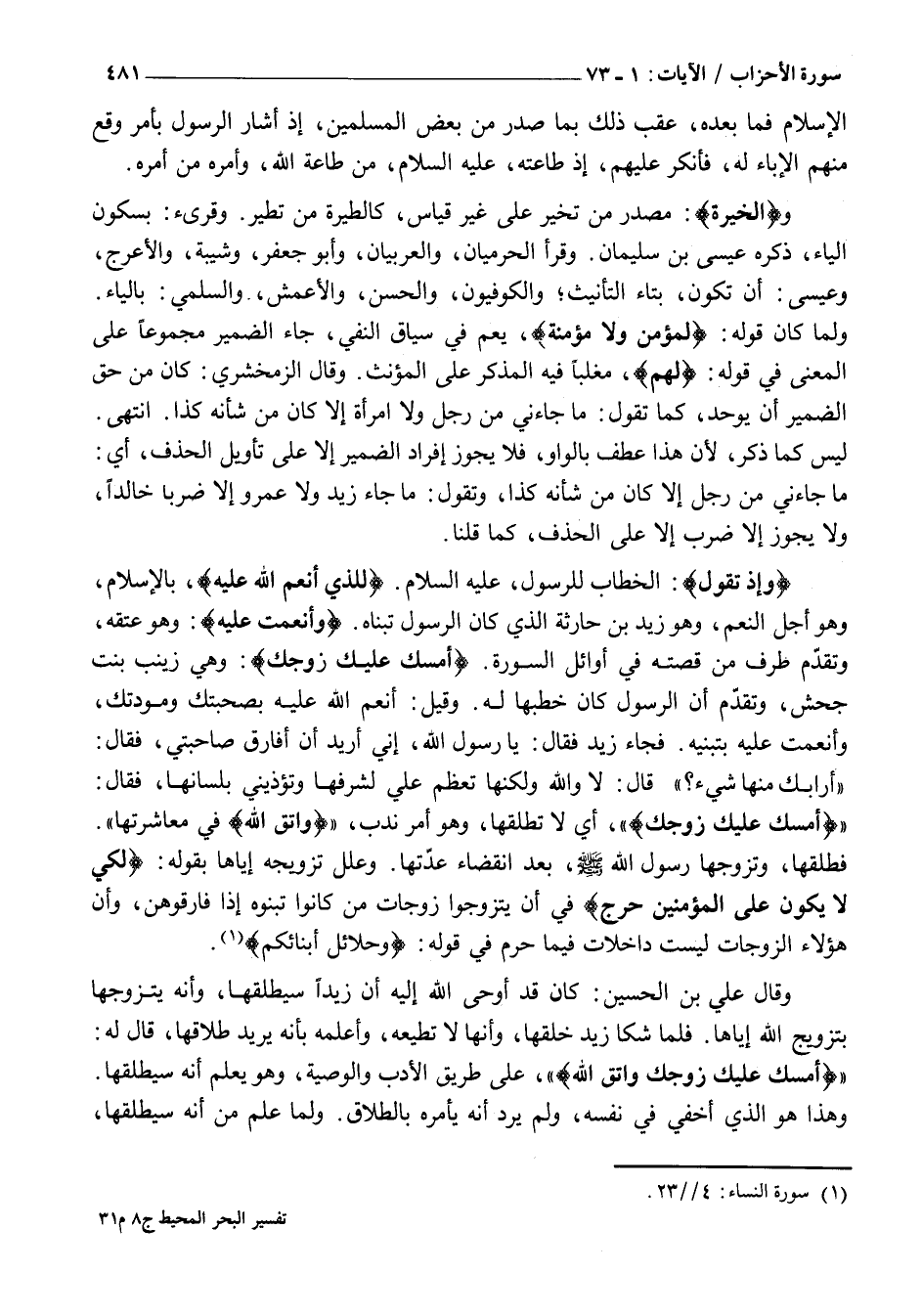 وَإِذْ تَقُولُ: الْخِطَابُ لِلرَّسُولِ، عَلَيْهِ السَّلَامُ. لِلَّذِي أَنْعَمَ اللَّهُ عَلَيْهِ، بِالْإِسْلَامِ، وَهُوَ أَجَلُّ النِّعَمِ، وَهُوَ زَيْدُ بْنُ حَارِثَةَ الَّذِي كان الرسول تَبَنَّاهُ. وَأَنْعَمْتَ عَلَيْهِ: وَهُوَ عِتْقُهُ، وَتَقَدَّمَ طَرَفٌ مِنْ قِصَّتِهِ فِي أَوَائِلِ السُّورَةِ. أَمْسِكْ عَلَيْكَ زَوْجَكَ: وَهِيَ زَيْنَبُ بِنْتُ جَحْشٍ، وَتَقَدَّمَ أن الرسول كَانَ خَطَبَهَا لَهُ.