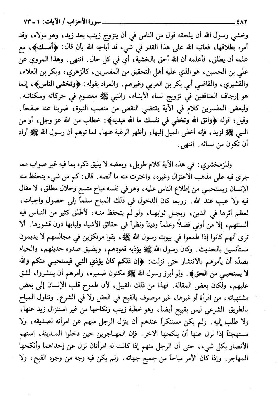 ، هُوَ الَّذِي عَلَيْهِ أَهْلُ التَّحْقِيقِ مِنَ الْمُفَسِّرِينَ، كَالزُّهْرِيِّ، وَبَكْرِ بْنِ الْعَلَاءِ، وَالْقُشَيْرِيِّ، وَالْقَاضِي أَبِي بَكْرِ بْنِ الْعَرَبِيِّ وَغَيْرِهِمْ. وَالْمُرَادُ بِقَوْلِهِ: وَتَخْشَى النَّاسَ، إِنَّمَا هُوَ إِرْجَافُ الْمُنَافِقِينَ فِي تزويج نساء الأبناء، وَالنَّبِيُّ صَلَّى اللَّهُ عَلَيْهِ وَسَلَّمَ مَعْصُومٌ فِي حَرَكَاتِهِ وَسَكَنَاتِهِ.