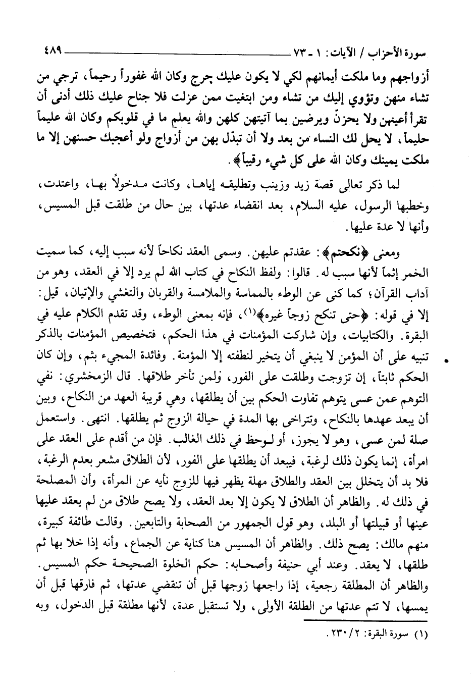 أَزْواجِهِمْ وَما مَلَكَتْ أَيْمانُهُمْ لِكَيْلا يَكُونَ عَلَيْكَ حَرَجٌ وَكانَ اللَّهُ غَفُوراً رَحِيماً، تُرْجِي مَنْ تَشاءُ مِنْهُنَّ وَتُؤْوِي إِلَيْكَ مَنْ تَشاءُ وَمَنِ ابْتَغَيْتَ مِمَّنْ عَزَلْتَ فَلا جُناحَ عَلَيْكَ ذلِكَ أَدْنى أَنْ تَقَرَّ أَعْيُنُهُنَّ وَلا يَحْزَنَّ وَيَرْضَيْنَ بِما آتَيْتَهُنَّ كُلُّهُنَّ وَاللَّهُ يَعْلَمُ مَا فِي قُلُوبِكُمْ وَكانَ اللَّهُ عَلِيماً حَلِيماً، لَا يَحِلُّ لَكَ النِّساءُ مِنْ بَعْدُ وَلا أَنْ تَبَدَّلَ بِهِنَّ مِنْ أَزْواجٍ وَلَوْ أَعْجَبَكَ حُسْنُهُنَّ إِلَّا مَا مَلَكَتْ يَمِينُكَ وَكانَ اللَّهُ عَلى كُلِّ شَيْءٍ رَقِيباً.