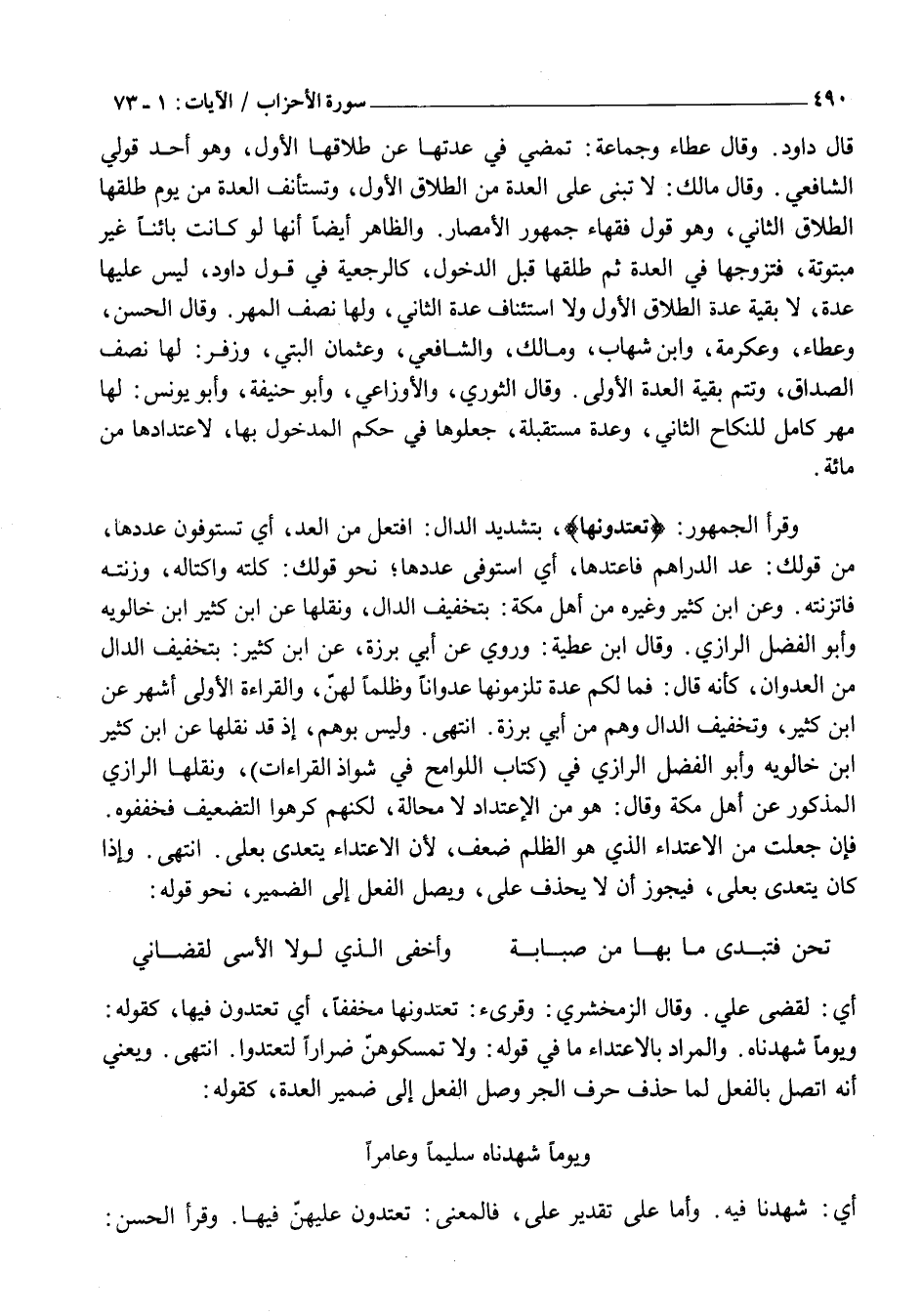 وَقَرَأَ الْجُمْهُورُ: تَعْتَدُّونَها، بِتَشْدِيدِ الدَّالِ: افْتَعَلَ مِنَ الْعَدِّ، أَيْ تَسْتَوْفُونَ عَدَدَهَا، مِنْ قَوْلِكَ: عَدَّ الدَّرَاهِمَ فَاعْتَدَّهَا، أَيِ اسْتَوْفَى عَدَدَهَا نَحْوَ قَوْلِكَ: كِلْتُهُ وَاكْتَالَهُ، وَزِنْتُهُ فَاتَّزَنْتُهُ. وَعَنِ ابْنِ كَثِيرٍ وَغَيْرِهِ مِنْ أَهْلِ مَكَّةَ: بِتَخْفِيفِ الدَّالِ، وَنَقَلَهَا عَنِ ابْنِ كَثِيرٍ ابْنُ خَالَوَيْهِ وَأَبُو الْفَضْلِ الرَّازِيُّ. وَقَالَ ابْنِ عَطِيَّةَ: وَرَوِيَ عَنِ أَبِي بَرْزَةَ، عَنِ ابْنِ كَثِيرٍ: بِتَخْفِيفِ الدَّالِ مِنَ الْعُدْوَانِ، كَأَنَّهُ قَالَ: فَمَا لَكُمْ عِدَّةٌ تَلْزَمُونَهَا عُدْوَانًا وَظُلْمًا لَهُنَّ، وَالْقِرَاءَةُ الْأُولَى أَشْهَرُ عَنِ ابْنِ كَثِيرٍ، وَتَخْفِيفُ الدَّالِ وَهْمٌ مِنْ أَبِي بَرْزَةَ. انْتَهَى. وَلَيْسَ بِوَهْمٍ، إِذْ قَدْ نَقَلَهَا عَنِ ابْنِ كَثِيرٍ ابْنُ خَالَوَيْهِ وَأَبُو الْفَضْلِ الرَّازِيُّ فِي (كِتَابِ اللَّوَامِحِ فِي شَوَاذِّ الْقِرَاءَاتِ) ، وَنَقَلَهَا الرَّازِيُّ الْمَذْكُورُ عَنْ أَهْلِ مَكَّةَ وَقَالَ: هُوَ مِنَ الِاعْتِدَادِ لَا مَحَالَةَ، لَكِنَّهُمْ كَرِهُوا التَّضْعِيفَ فَخَفَّفُوهُ.