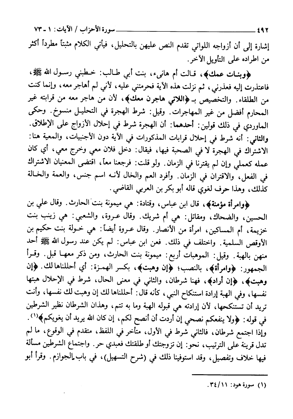 وَقِيلَ: الْمُوهِبَاتُ أَرْبَعٌ: مَيْمُونَةُ بِنْتُ الْحَارِثِ، وَمَنْ ذُكِرَ مَعَهَا قَبْلُ. وَقَرَأَ الْجُمْهُورُ: وَامْرَأَتَ، بِالنَّصْبِ إِنْ وَهَبَتْ، بِكَسْرِ الْهَمْزَةِ: أَيْ أَحْلَلْنَاهَا لَكَ. إِنْ وَهَبَتْ، إِنْ أَرادَ، فَهُنَا شَرْطَانِ، وَالثَّانِي فِي مَعْنَى الْحَالِ، شَرْطٌ فِي الْإِحْلَالِ هِبَتُهَا نَفْسَهَا، وَفِي الْهِبَةِ إِرَادَةُ اسْتِنْكَاحِ النَّبِيِّ، كَأَنَّهُ قَالَ: أَحْلَلْنَاهَا لَكَ إِنْ وَهَبَتْ لَكَ نَفْسَهَا، وَأَنْتَ تُرِيدُ أَنْ تَسْتَنْكِحَهَا، لِأَنَّ إِرَادَتَهُ هِيَ قَبُولُهُ الْهِبَةَ وَمَا بِهِ تَتِمُّ، وَهَذَانِ الشَّرْطَانِ نَظِيرُ الشَّرْطَيْنِ فِي قَوْلِهِ: وَلا يَنْفَعُكُمْ نُصْحِي إِنْ أَرَدْتُ أَنْ أَنْصَحَ لَكُمْ، إِنْ كانَ اللَّهُ يُرِيدُ أَنْ يُغْوِيَكُمْ «1» .